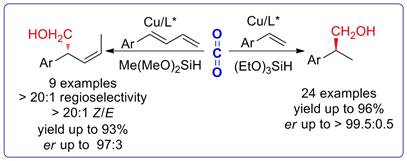 99. Y.-Y. Gui,† N. Hu,† X.-W. Chen, L.-L. Liao, T. Ju, J.-H. Ye, Z. Zhang, J. Li, D.-G. Yu*, Highly Regio- and Enantioselective Copper-Catalyzed Reductive Hydroxymethylation of Styrenes and 1,3-Dienes with CO2. J. Am. Chem. Soc. 2017, 139, 17011. († Equal contribution. Cover. Top 4 most read JACS papers in November, 2017. Highlighted by Synfacts 2018, 14, 0177, CJOC, X-MOL, OPR&D and Organic Chemistry Portal)