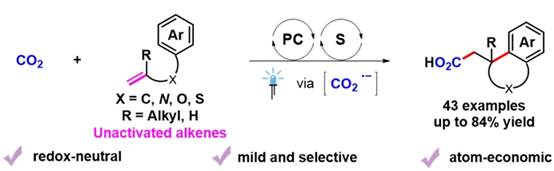 31. W. Zhang, Z. Chen, Y.-X. Jiang, L.-L. Liao, W. Wang, J.-H. Ye*, D.-G. Yu*, Arylcarboxylation of unactivated alkenes with CO2 via visible-light photoredox catalysis. Nat. Commun. 2023, 14, 3529.