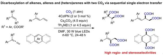 59. T. Ju, Y.-Q. Zhou, K.-G. Cao, Q. Fu, J.-H. Ye, G.-Q. Sun, X.-F. Liu, L. Chen, L.-L. Liao, D.-G. Yu*, Dicarboxylation of alkenes, allenes, and (hetero)arenes with CO2 via visible-light photoredox catalysis. Nat. Catal. 2021, 4, 304–311.