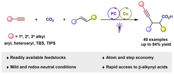 3. J.-C. Xu,† J.-P. Yue,† M. Pan, Y.-C. Chen, W. Wang, X. Zhou, W. Zhang*, J.-H. Ye, D.-G. Yu*, Metallaphotoredox-catalyzed alkynylcarboxylation of alkenes with CO2 and alkynes for expedient access to β-alkynyl acids. Nat. Commun. 2025, 16, 1850. († Equal contribution. Highlighted by Synfacts 2025, 21, 594)