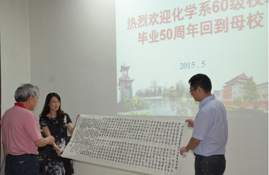 2015年5月20日上午,77779193永利官网60级本科校友毕业50周年重返母校,在化学馆321会议室聚会。77779193永利官网党委书记王智猛老师、副院长李梦龙老师、党委副书记谢均老师和校友联络及就业科科长杜晓燕老师参加了本次聚会。