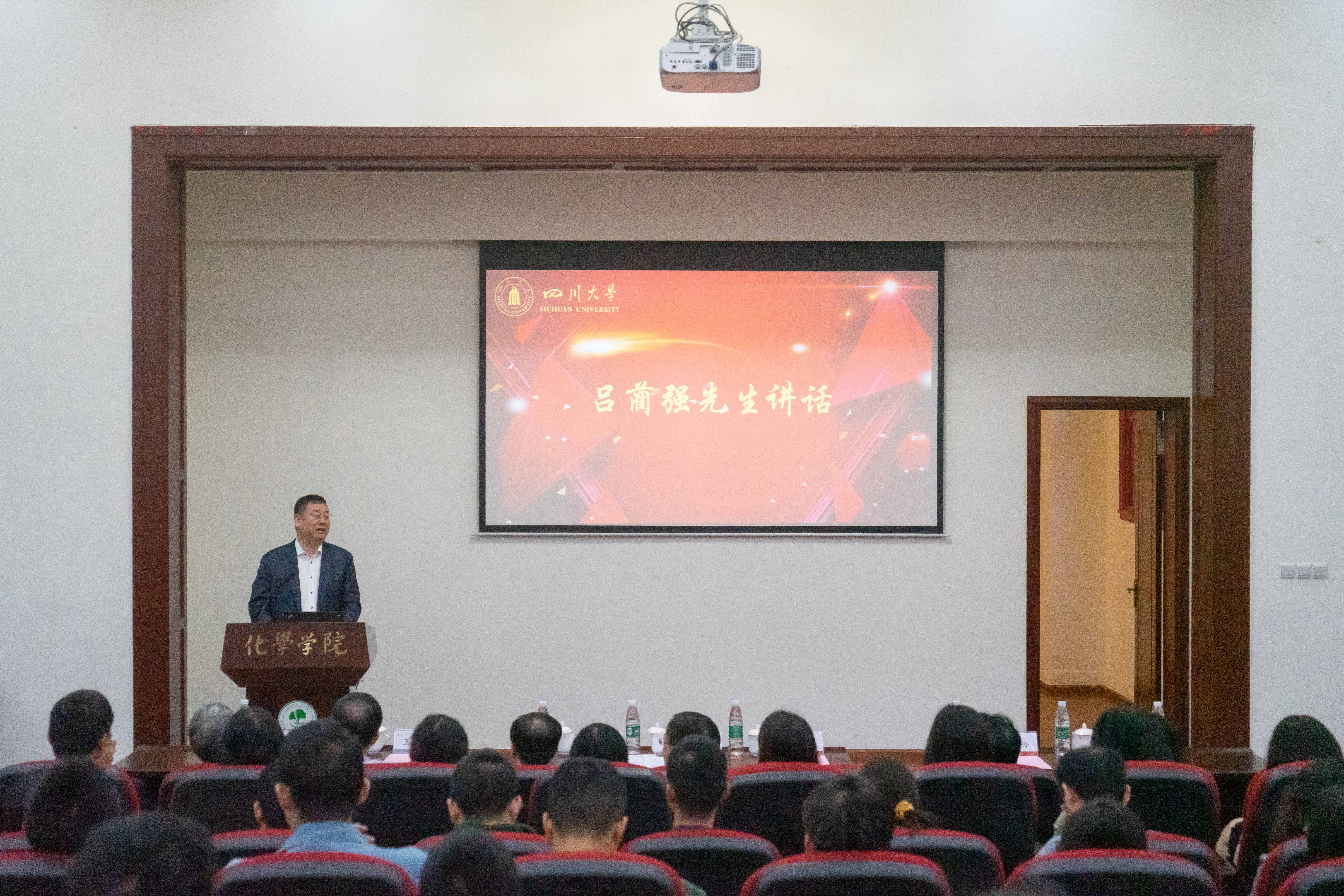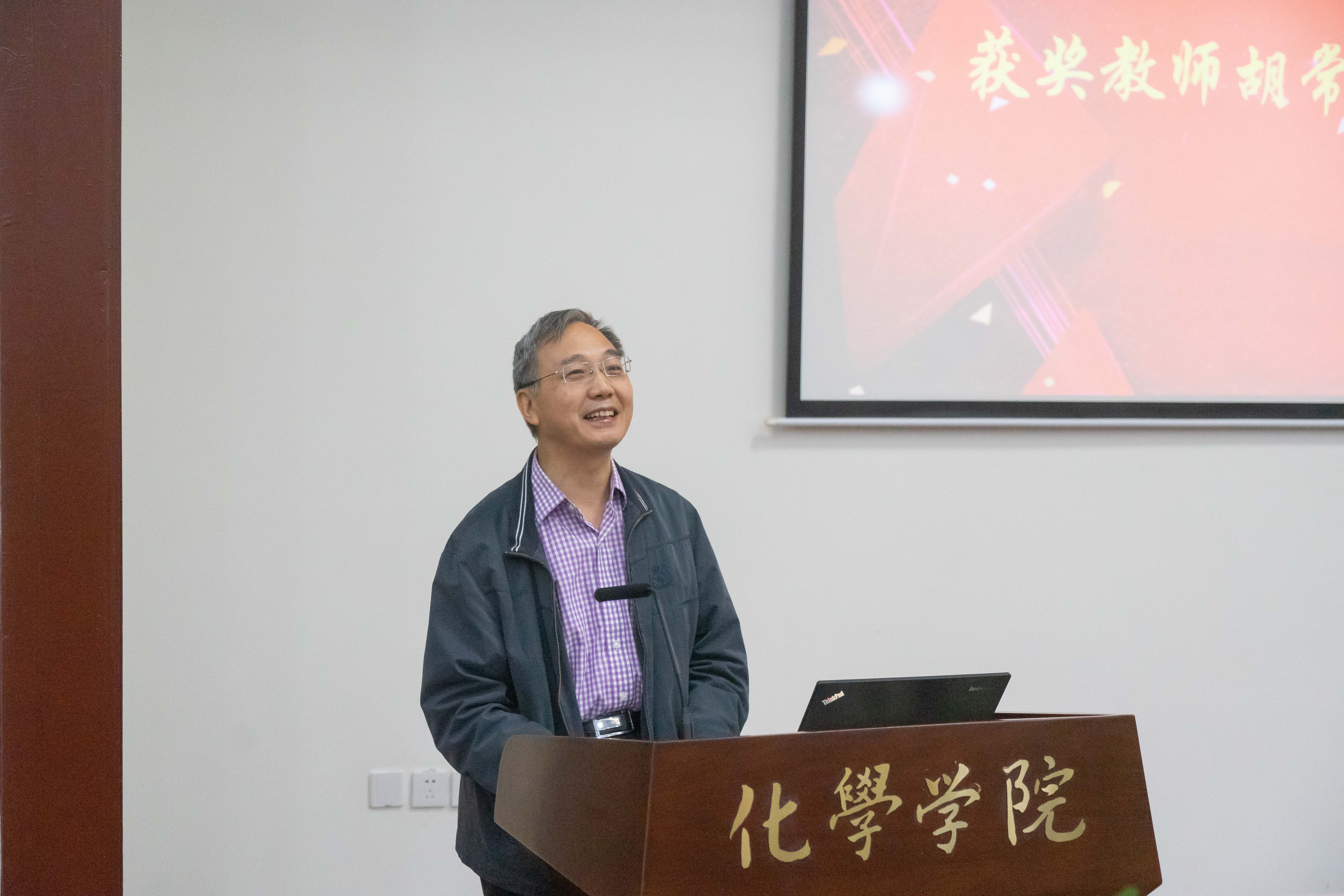 随后,李言荣校长和吕蔺强先生为荣获顺通奖教金的冯小明院士、王玉忠院士、胡常伟教授颁奖。胡常伟教授作为获奖代表发言。胡常伟教授首先代表三位获奖老师向四川顺通实业有限公司及吕蔺强先生对学校和学院发展的支持表示感谢,他说自己将继续努力,为学校双一流建设添砖加瓦,为化学学科的进一步发展竭力工作。