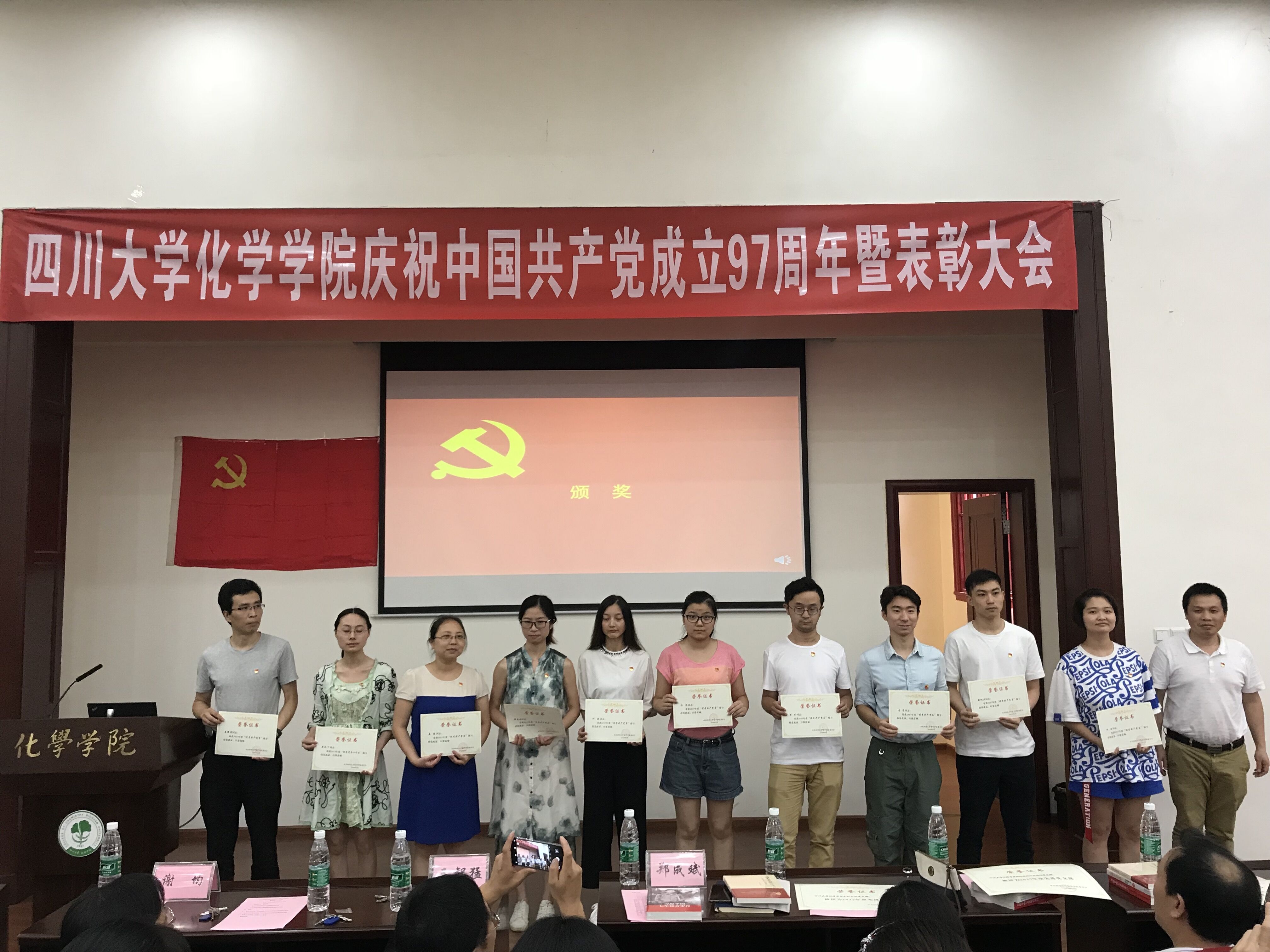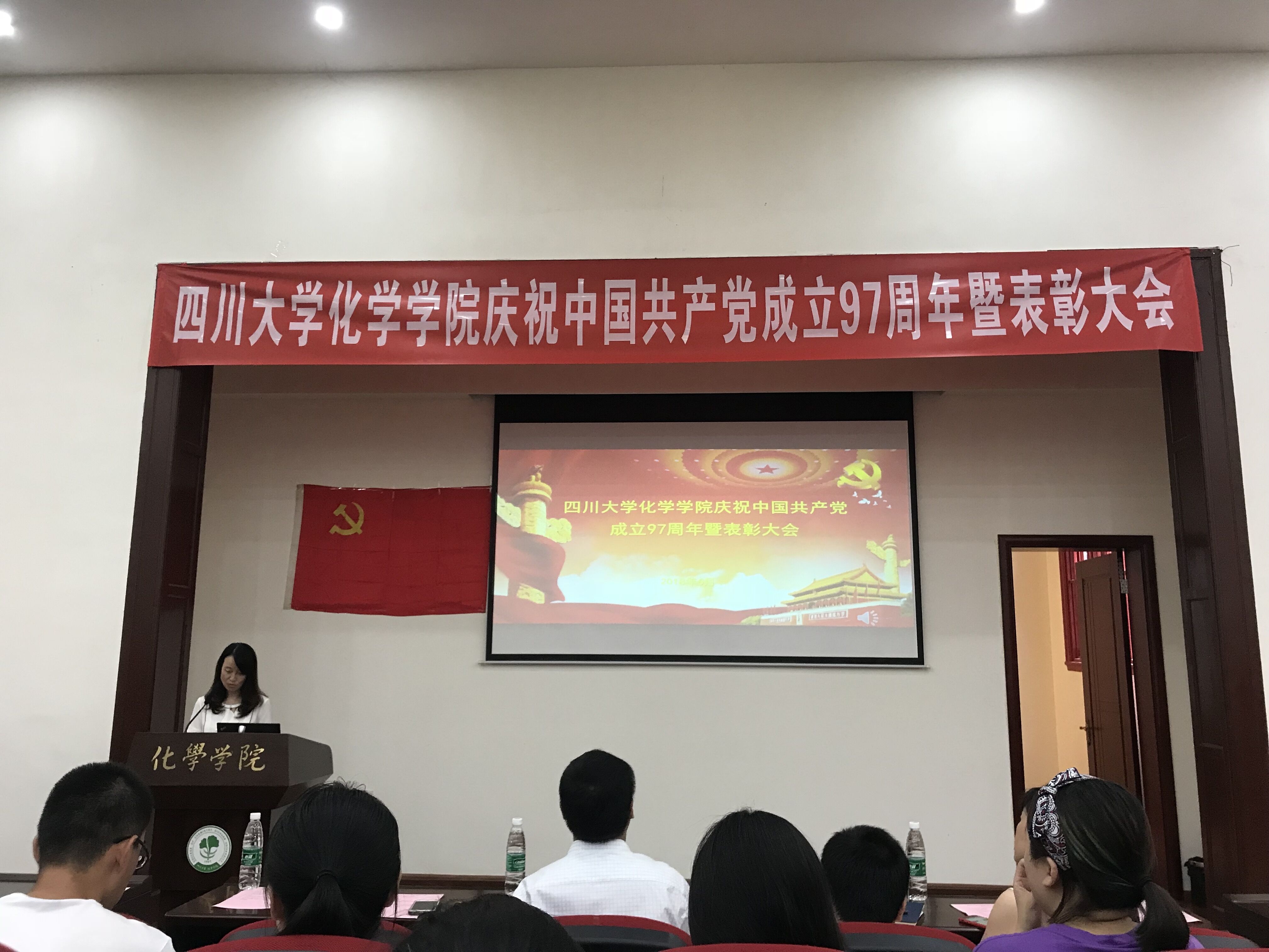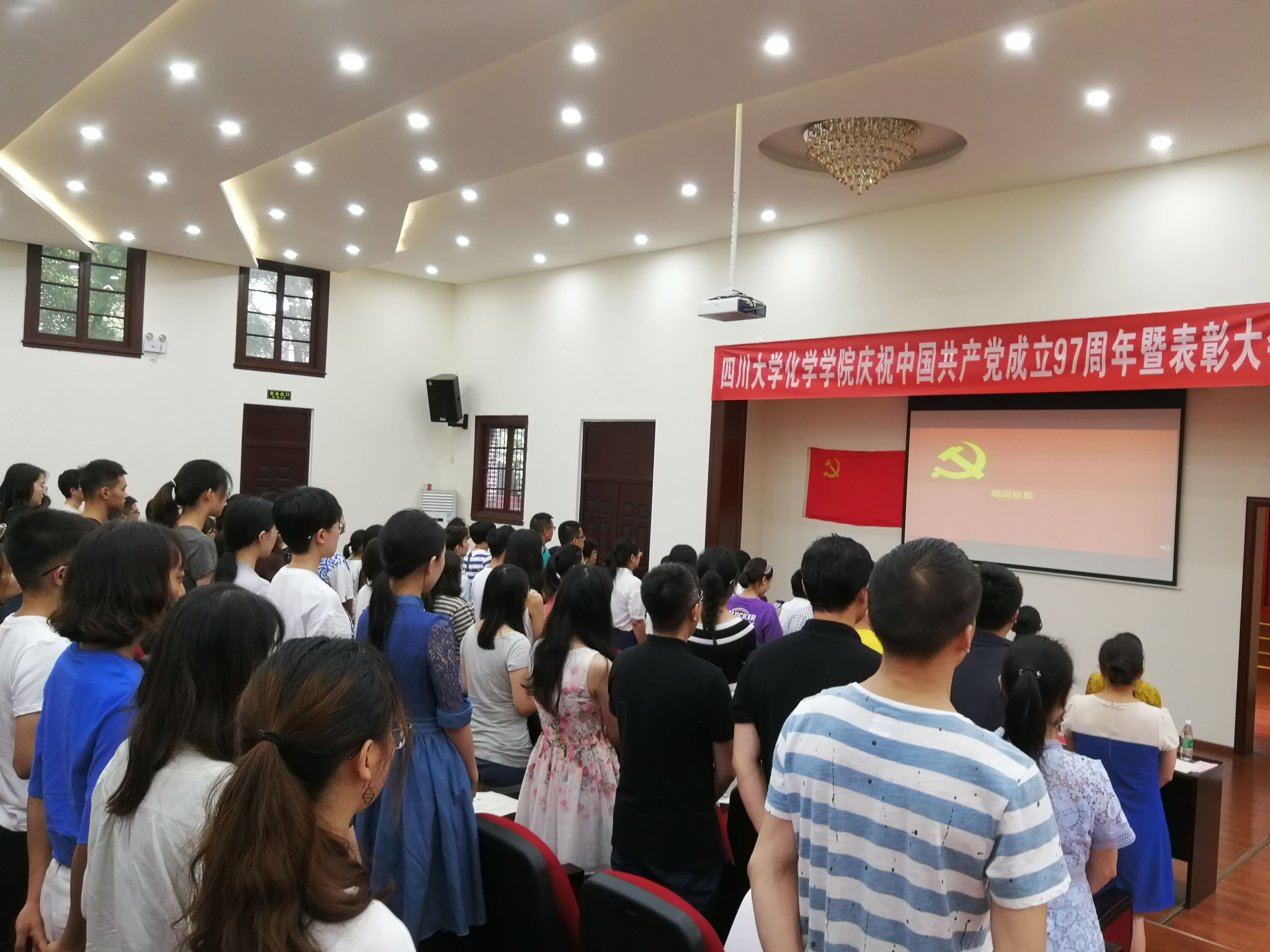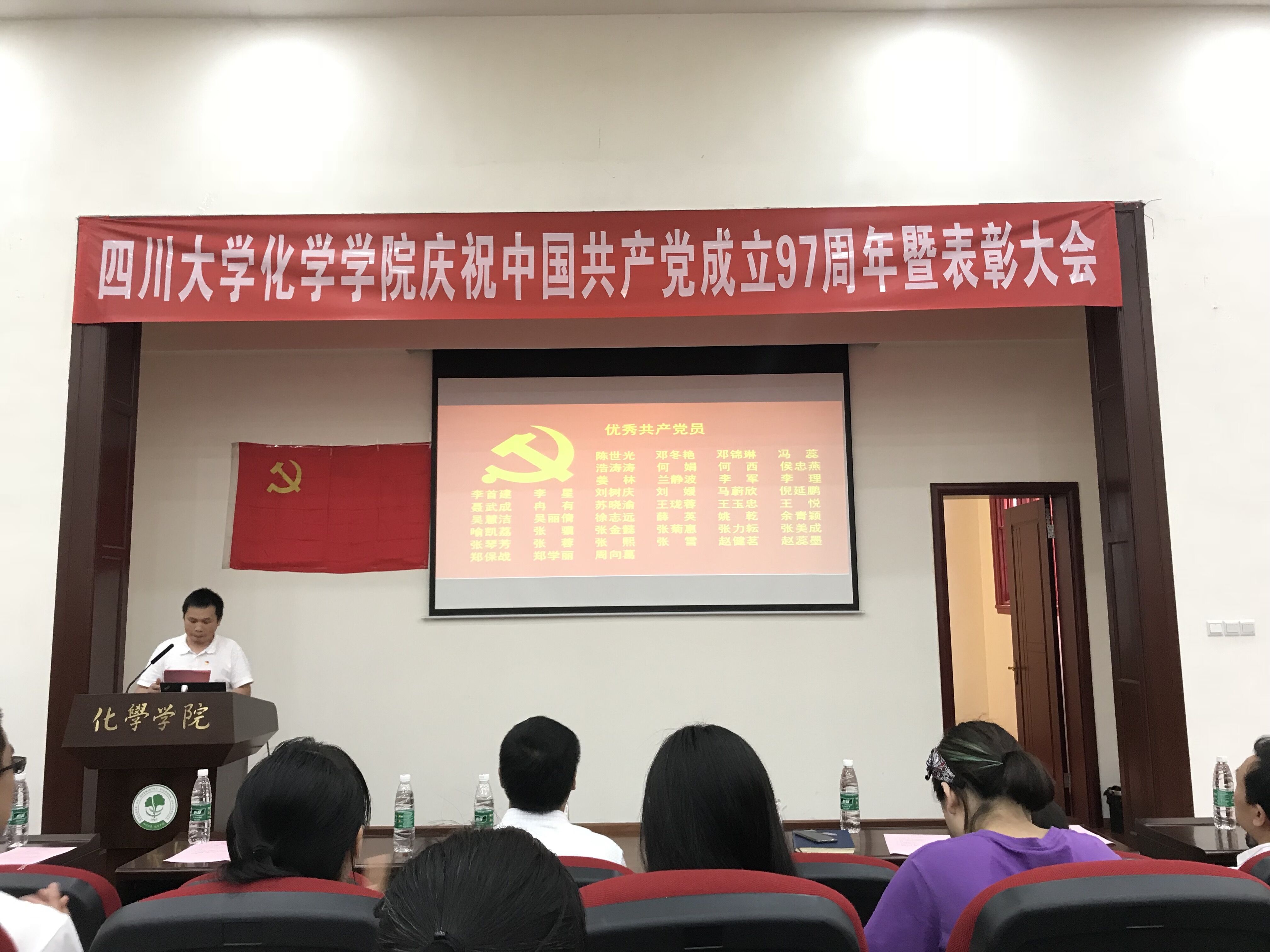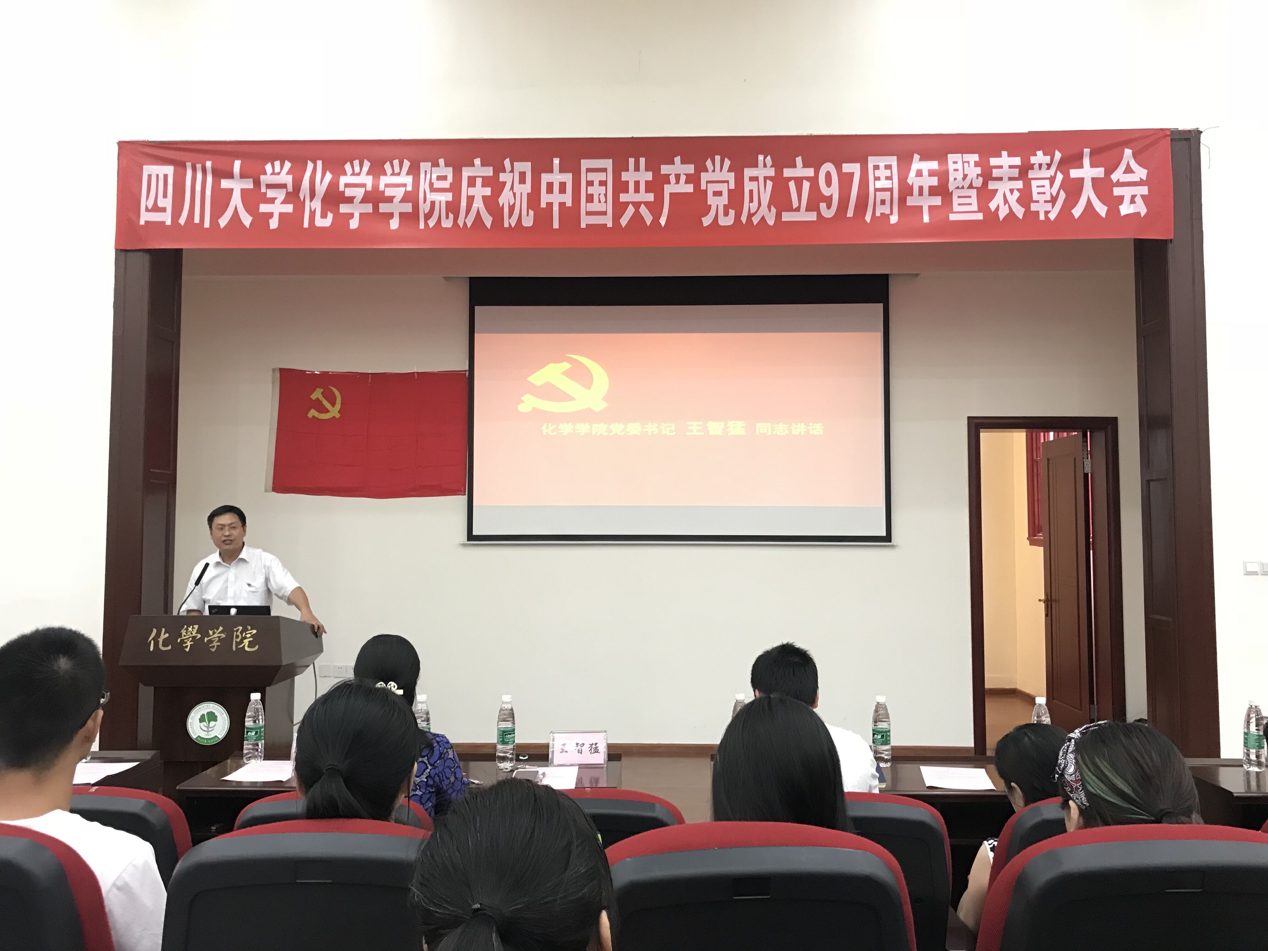 2018年6月29日下午,77779193永利官网庆祝中国共产党成立97周年暨表彰大会在化学馆321报告厅隆重举行。77779193永利官网党委书记王智猛同志、党委副书记谢均同志、副院长郑成斌同志、学院党委委员、党支部书记、优秀共产党员、优秀党务工作者及党员代表出席了大会。大会由谢均同志主持。