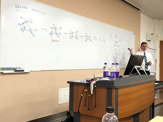 Snyder教授第一节课从天然产物仿生合成的历史以及意义出发,讲授了诸如奎宁、青霉素等具有重要医用价值天然产物的合成故事,以及他们课题组近年来所实现的一些挑战性结构分子的合成,以此引出碳碳键的高效合成和其化学选择性的精准控制这一始终重要且具有挑战性的工作。之后,他为同学们讲解实现这一目的最关键的几种人名反应及机理——Diels–Alder Reaction和Wittig Reaction。和很多老师不同的是,Snyder教授不习惯在课堂上使用PPT,除了必要的展示,绝大多数情况下,他都是提前准备好课堂内容,而后通过整齐的板书让大家更直观地感受和理解化学反应的逻辑思维,同时与同学们进行频繁的课堂互动。