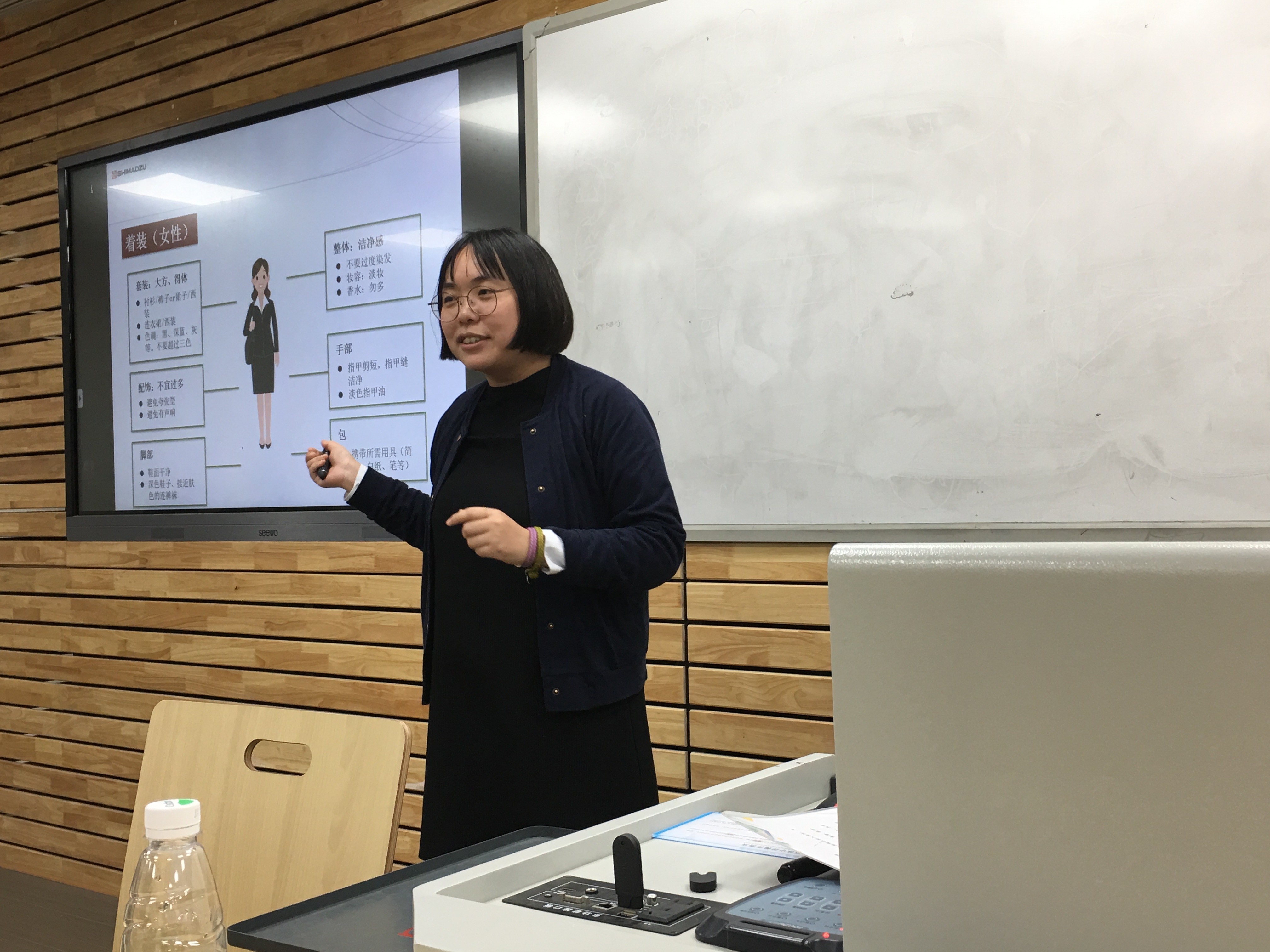 首先,马俪老师让大家回忆大一上的职业生涯规划课给大家布置的作业开始,回顾了大学每一年大致的成长过程。接着,以一份往届学生的简历作为例子,为同学们详细讲解了简历的写作技巧,特别是在个人信息、实习工作、教育经历、主要技能等多方面入手为同学们作了详细讲解。讲述了中英文的差异以及在简历中主题与关键词的合理编辑方式,并强调“实事求是”是简历的核心要义。在面试部分,马俪老师介绍了四种常见的面试形式,即电话测试、短信邮件测试、无领导小组面试以及个人面试。穿插有趣的事例帮助同学们区分各种不同场合的注意事项。在个人面试准备部分中,马老师给同学们提出了几点面试前准备工作的建议,从而引导同学们如何在面试中脱颖而出。随后,张燕女士为同学们讲解了面试着装的相关知识,例如合身的重要性与颜色的选择,并补充了其他的注意事项。