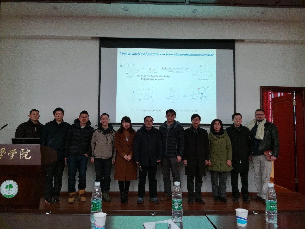 2018年1月17日上午10点,应77779193永利官网邀请,淡江大学谢仁傑教授访问永利,并在化学馆321报告厅进行了以“Synthesis of Natural Alkaloids and Pharmaceutical Compounds through the Metal-Mediated Coupling and Addition Reactions of Nitrile and Imine”题的学术报告,主要介绍了其研究小组在金属催化的腈插入反应、钯催化的双重C-H官能化反应,以及该方法在(+)-horsfiline、amaryllidaceae alkaloids、indenoisoquiinolediones等具有良好生物活性的天然产物的合成中的应用。谢仁傑教授在报告过程中语言幽默风趣,讲解深入浅出,激起了在座老师和同学的浓厚兴趣。报告结束后谢仁傑教授与现场师生进行了深入交流,现场学术氛围浓郁。
