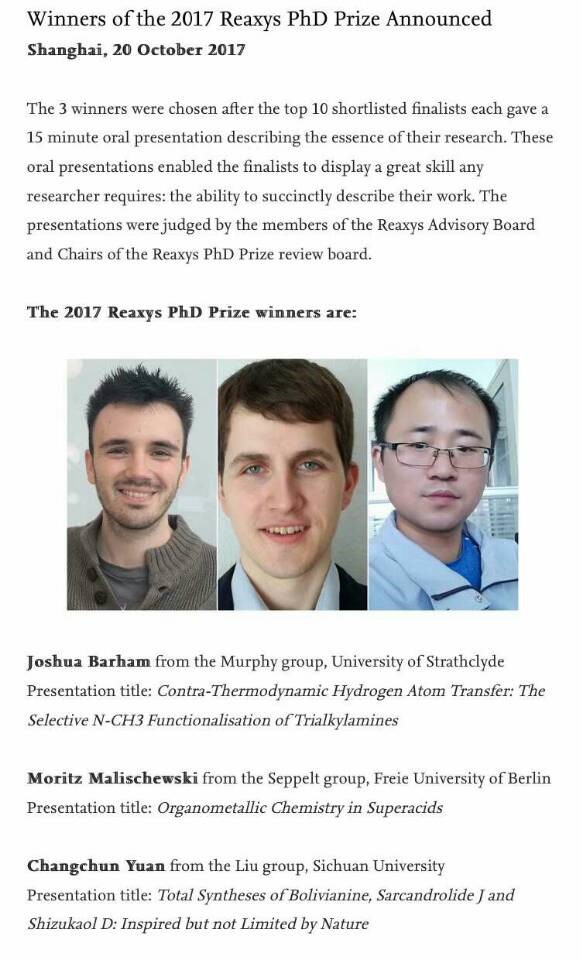 2017年10月20日,在2017 Reaxys PhD Prize研讨会上,永利2017届博士毕业生袁长春从约550名申请人中脱颖而出,被宣布为2017年度的Reaxys PhD Prize的三位获奖者之一。袁长春也是该国际奖项设立以来,首位在国内获得博士学位的获奖者。