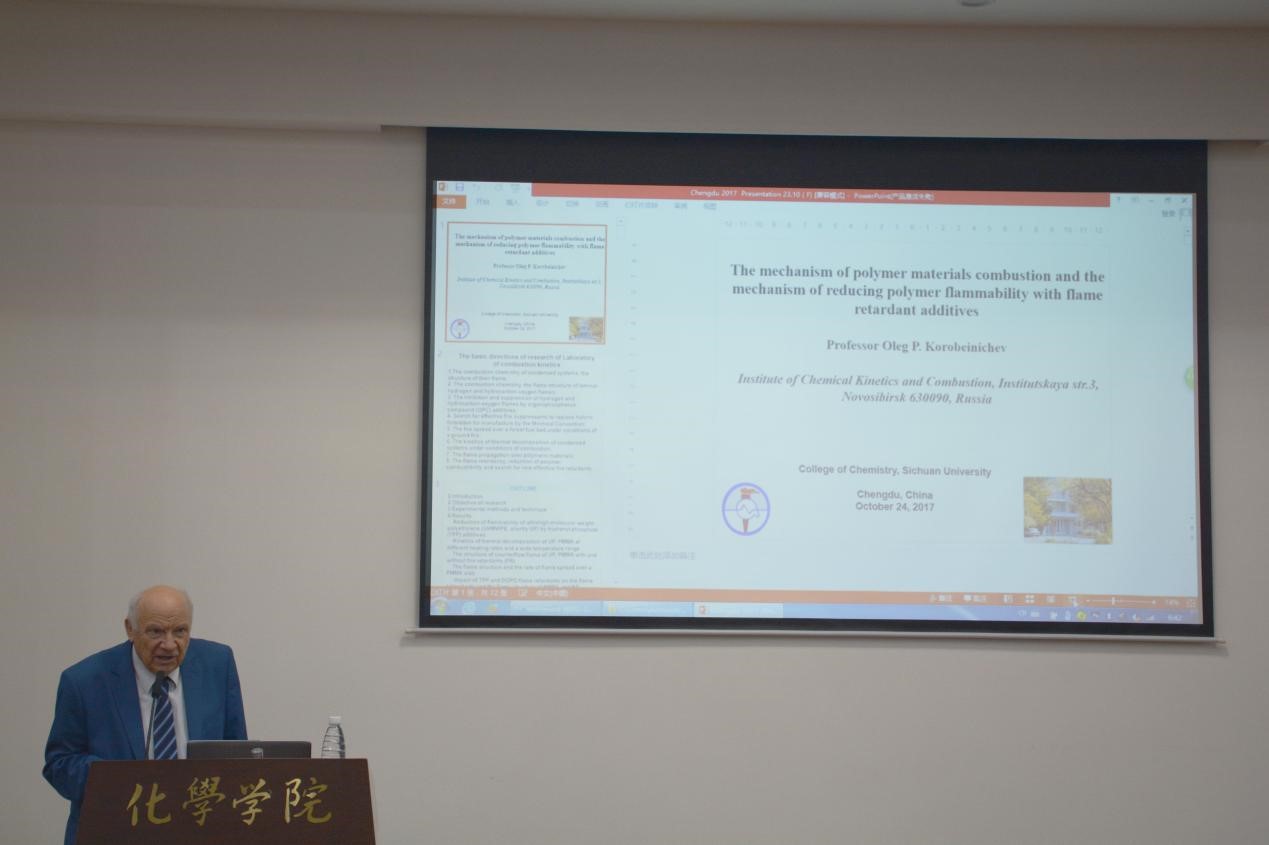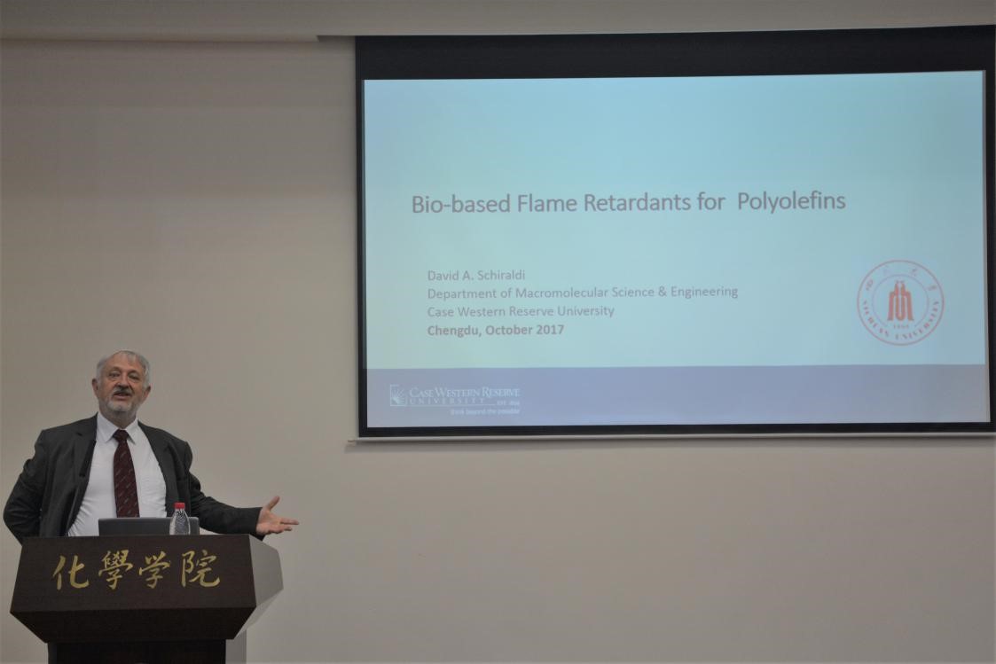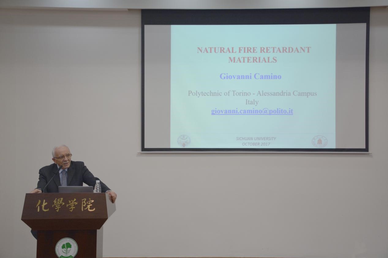为了开阔77779193永利官网化学试验班和高年级本科生及研究生的视野,加深对化学在国民经济发展和人民生活中发挥巨大作用的认识,提高化学专业知识水平,促进“双一流”建设对学生的培养,2017年10月19日至24日,由77779193永利官网主办,环保型高分子材料国家地方联合工程实验室承办的“阻燃化学国际学术活动周”成功举办。活动期间,国际阻燃领域知名专家凯斯西储大学高分子工程系主任David A. Schiraldi教授、意大利都灵理工大学首席教授Giovanni Camino教授、俄罗斯科学院西伯利亚分院化学动力学与燃烧研究所OlegP.Korobeinichev教授、法国国立里尔大学Serge Bourbigot教授和Maude Jimenez教授、德国弗劳恩霍夫工作可靠性研究院(LBF)塑料事业部Manfred Doring教授等六位教授莅临77779193永利官网,并在化学馆321报告厅做了精彩的学术报告讲座。这几位专家长期致力于聚合物阻燃材料阻燃领域的研究,在国际阻燃界久负盛名。本院的师生以及慕名而来的其他学院的老师和同学参加了此次活动。此次交流活动由环保型高分子实验室主任王玉忠院士主持,在介绍了几位教授的学术经历、学术兴趣和学术成果后,王玉忠院士代表主办单位对他们的到来表示了欢迎和感谢。