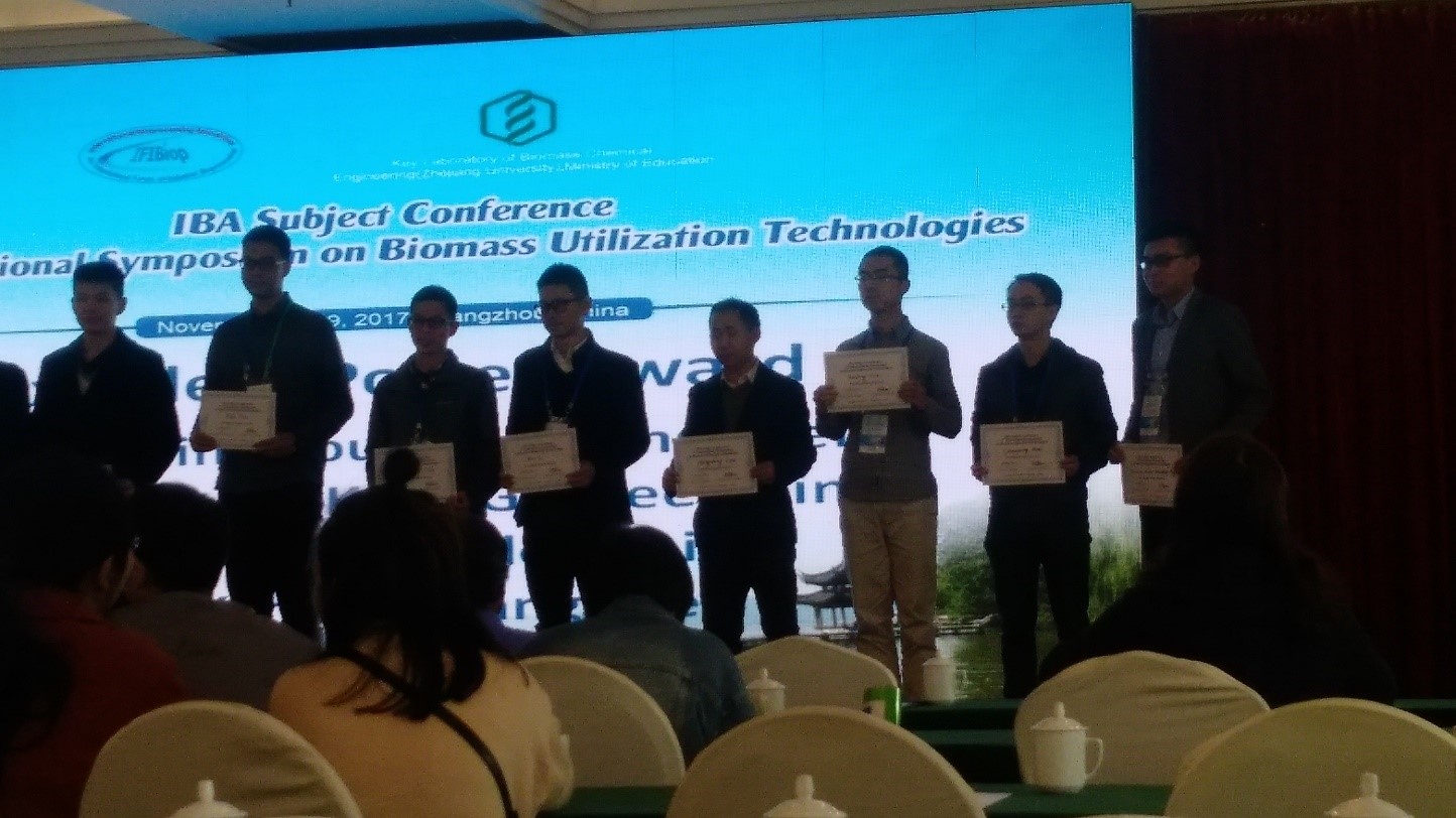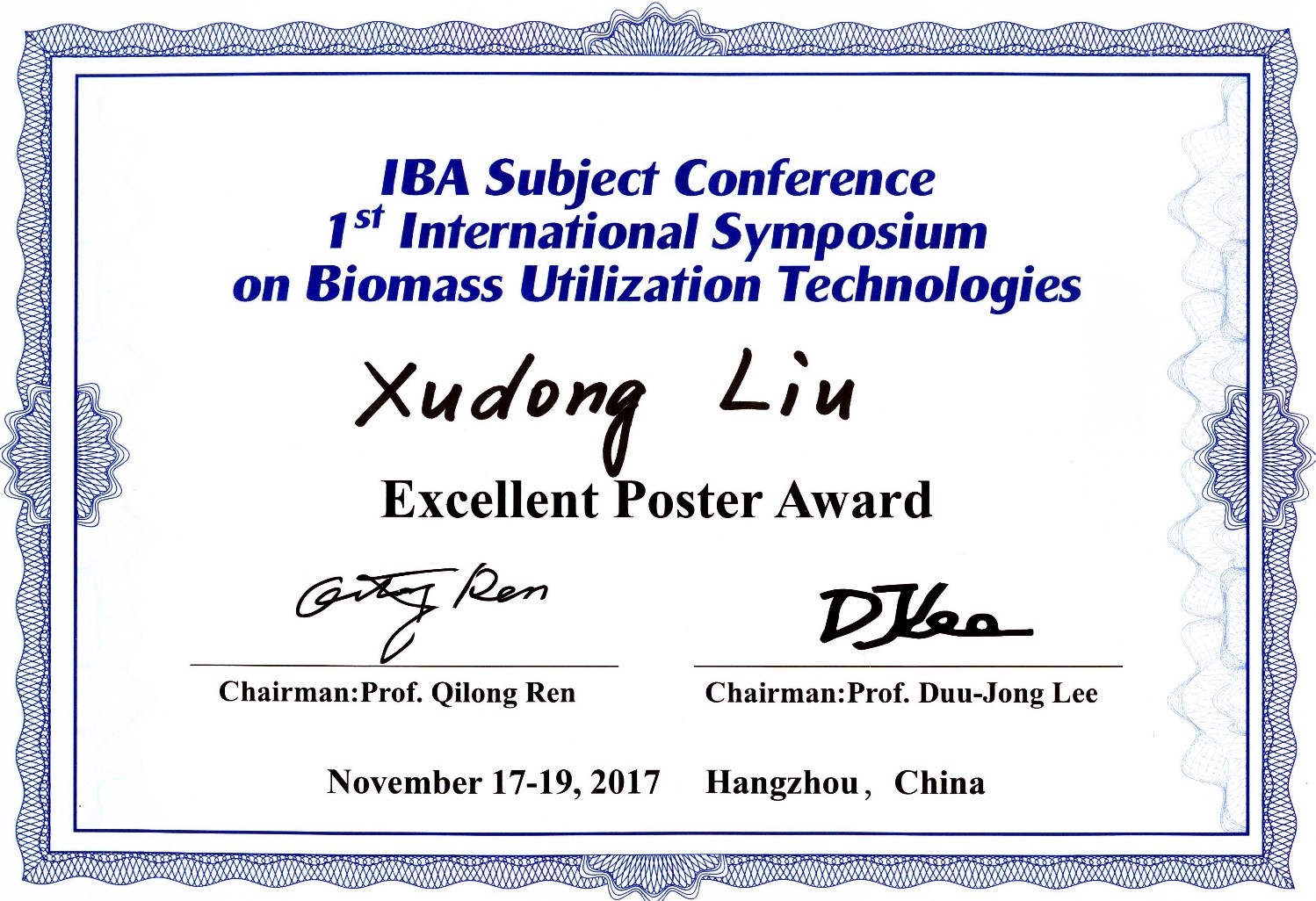 第一届生物质利用技术国际论坛(1stInternational Symposium on Biomass Utilization Technologies)于2017年11月17日-19日在美丽的杭州西子湖畔举行。该会议由国际生物过程协会和浙江大学生物质化工教育部重点实验室共同主办,会议主题包括生物质化学与热化学转化、生物转化,生物质的高附加值利用与过程,生物基材料与催化剂。来自美国、丹麦、澳大利亚等10余个国家从事生物质化工领域的数百名科研工作者参加了此次会议,大会分为全体报告,专题特邀报告、分会邀请报告、口头报告、墙报展示等,会议期间主办方评选出优秀口头报告和优秀墙报展示。永利2017级硕士研究生刘旭东(导师:胡常伟教授)以 “Investigation on the dissolution and depolymerization of lignin in H2O-butanol co-solvent” 为题的墙报展示获得大会“优秀墙报展示奖”(Excellent Poster Award)。