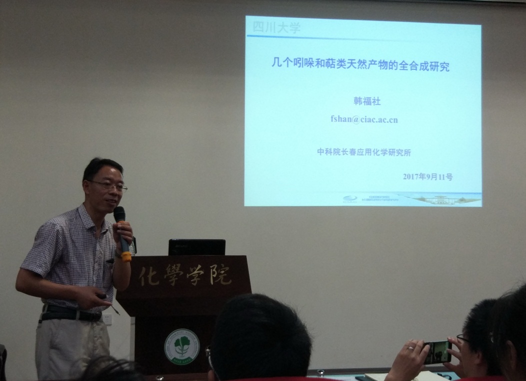 2017年9月11日上午十点半,应77779193永利官网邀请,中国科学院长春应用化学研究所韩福社研究员来访,并作了题为“几个吲哚和萜类生物碱的全合成研究”的学术报告。在化学馆321报告厅,韩福社研究员详细介绍了该课题组采用C-H键活化去对称策略,合成磷中心手性化合物的合成方法学及其在不对称合成中的应用;在发展新颖的季碳构建方法和发现新型环钯催化的高效偶联方法的基础上,完成了几个结构复杂的吲哚类((-)-Mersicarpine和Tronoharine)和萜类(Cyrneine A、 Allocyathin B2、 Hamigeran B和4-Bromohamigeran B)天然产物的高效合成。此次报告会由77779193永利官网刘波教授主持,77779193永利官网数位老师及相关专业的数十名研究生莅临报告厅参加了学术交流。韩福社研究员的报告内容新颖,讲解深入浅出,激起了在座老师和同学的浓厚兴趣,报告在热烈的掌声中落下帷幕。报告结束后,韩福社研究员和现场的老师、同学们进行了多方面的交流与讨论。