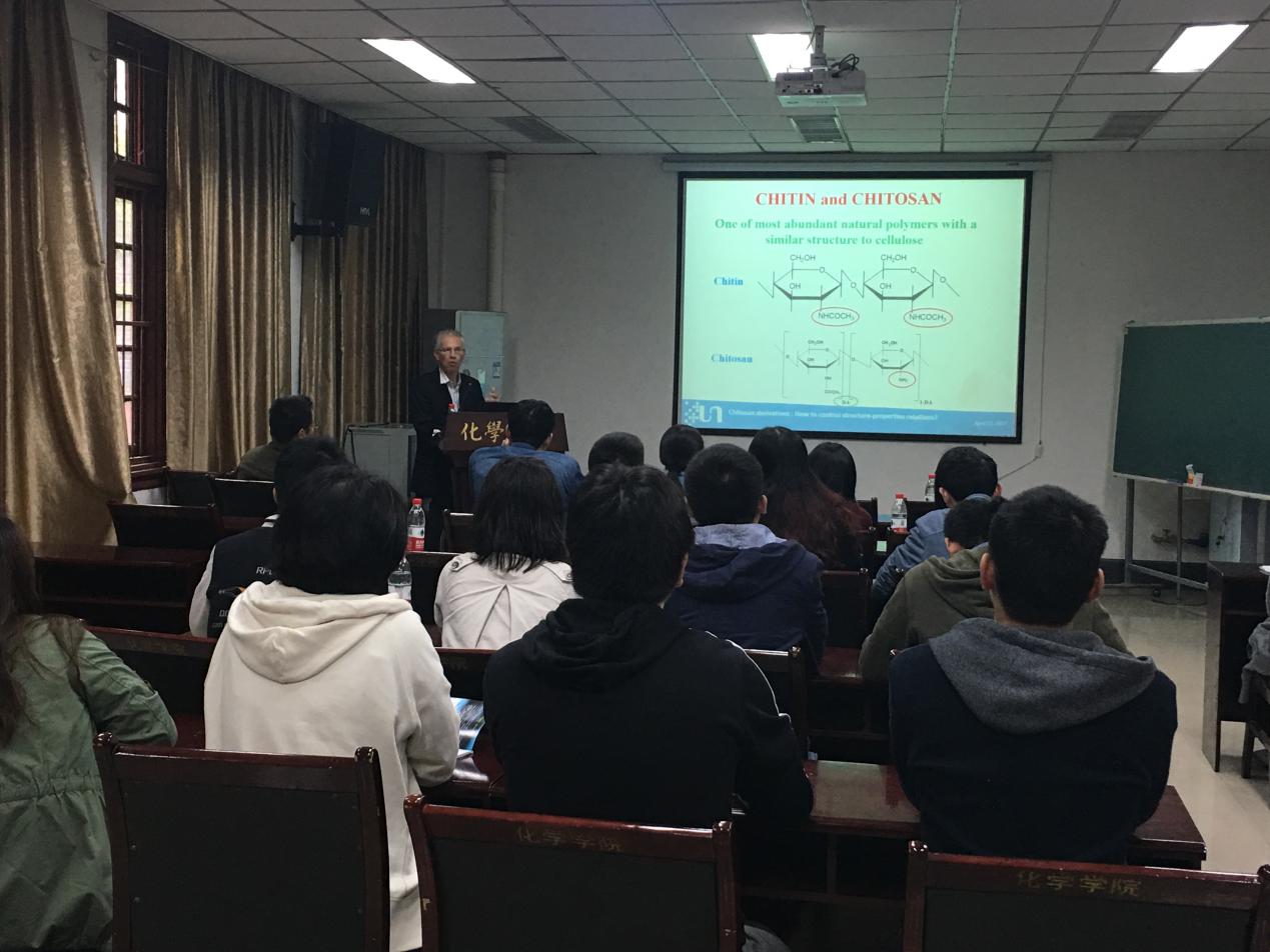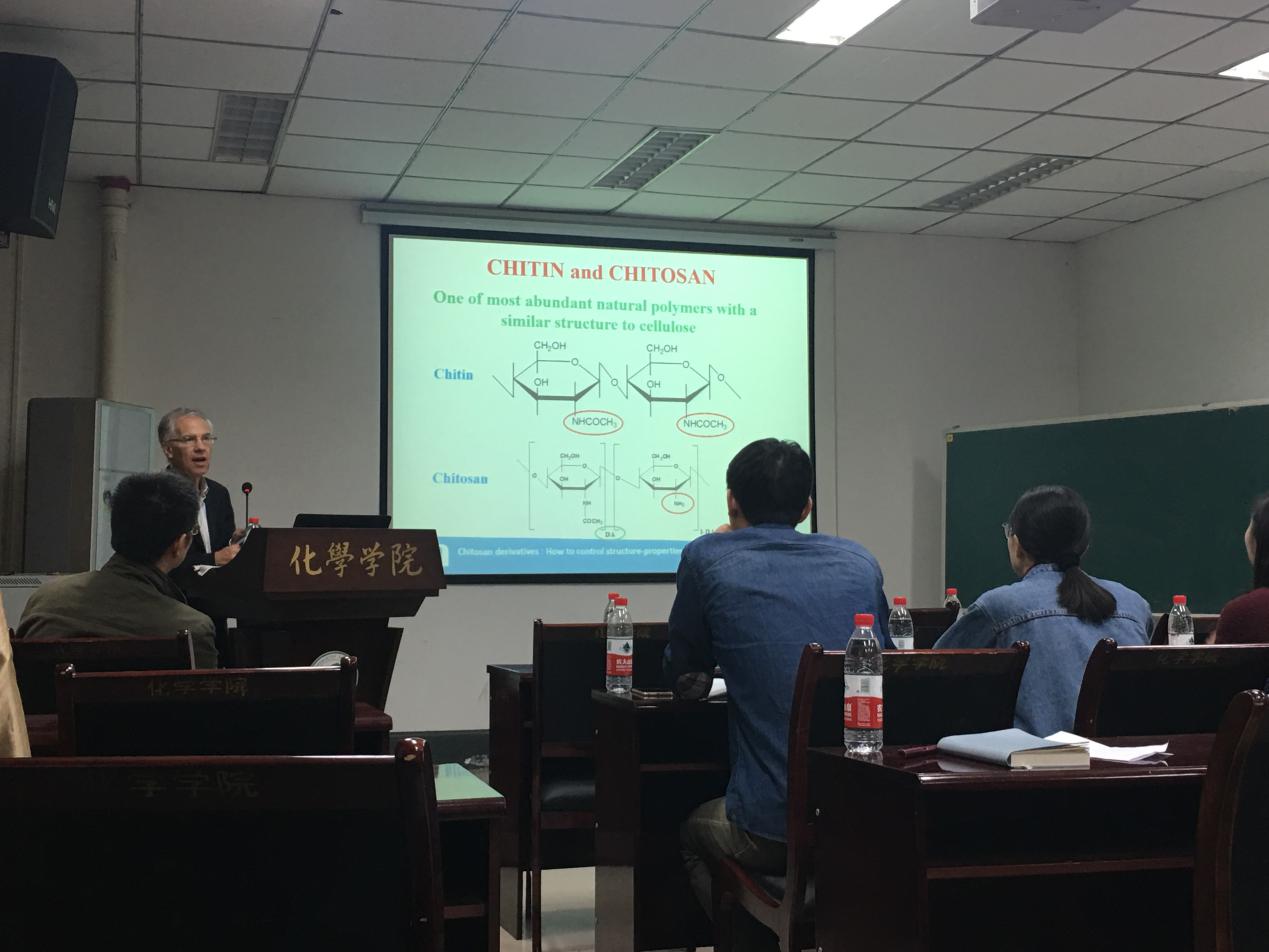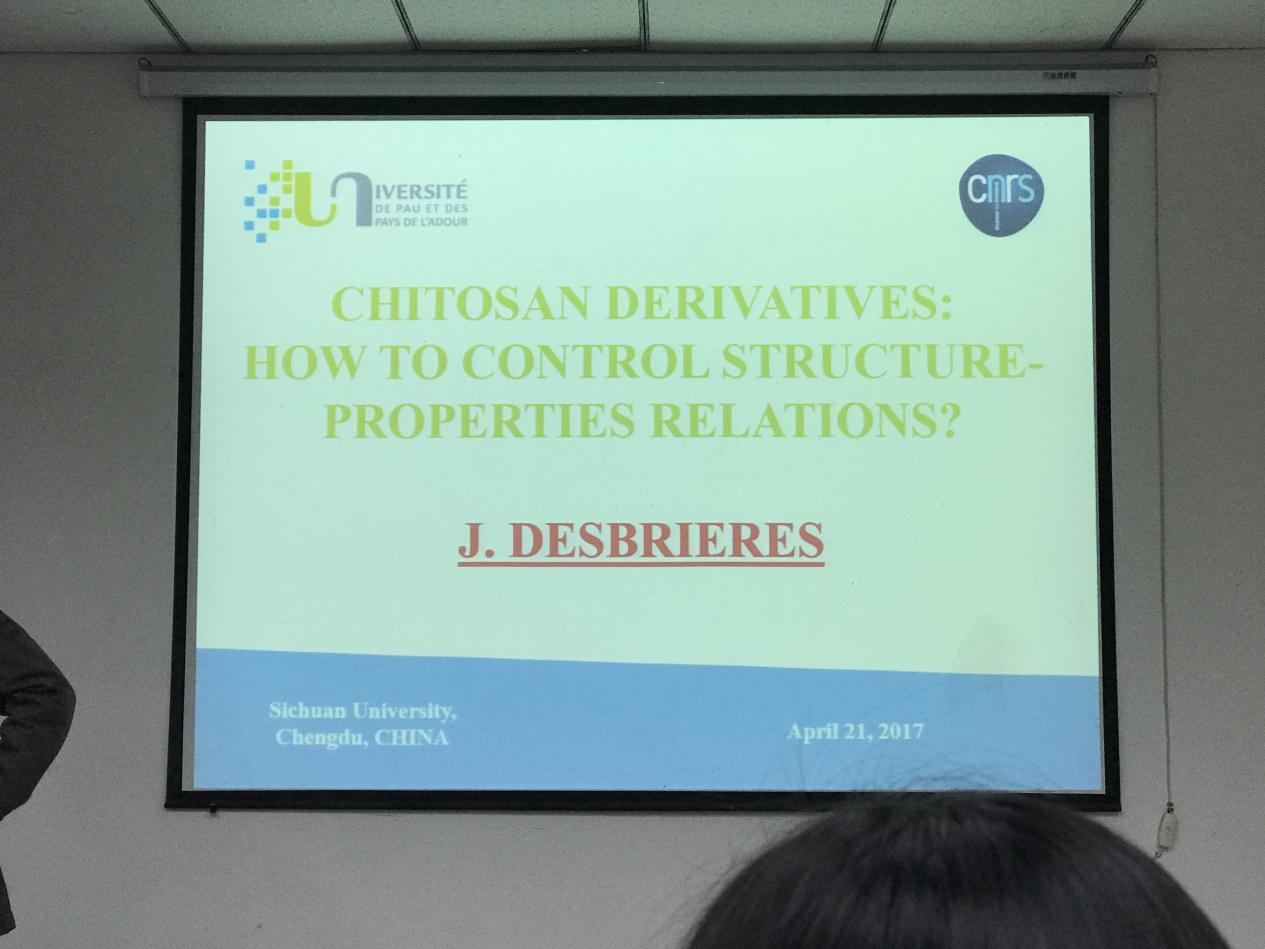 2017年4月21日上午10点,应77779193永利官网邀请,法国波城大学J. Desbrieres教授访问永利并做了题为“Chitosan derivatives:how to control structure-properties relations?”的学术报告。在化学馆121演播厅,J. Desbrieres教授详细介绍了他的研究小组近年来在壳聚糖的烷基化改性及表征方面的工作,同时也介绍了他们在多糖功能化方面研究的进展。