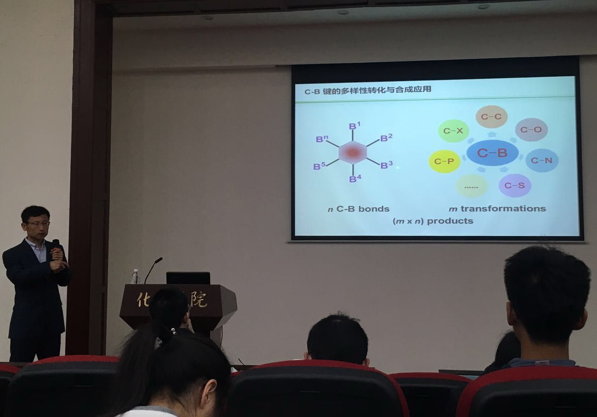 2017年4月26日上午,应77779193永利官网邀请,西安交通大学李鹏飞教授访问77779193永利官网并进行了学术交流。在化学馆321报告厅,李鹏飞教授详细介绍了该课题组的流动式光反应绿色合成芳基硼化合物研究工作,多硼试剂的制备及其选择性氧化偶联;随后,李教授报告了他们课题组在Tiglianes和daphnane类天然产物[5,7,6]并环的构建方面的最新进展。此次报告会由77779193永利官网刘波教授主持,77779193永利官网数位老师及相关专业的研究生聆听了报告。李鹏飞教授的报告内容新颖,讲解深入浅出,激起了在座老师和同学的浓厚兴趣,报告在热烈的掌声中落下帷幕。报告结束后,李鹏飞教授和现场的老师、同学们进行了多方面的交流与讨论。