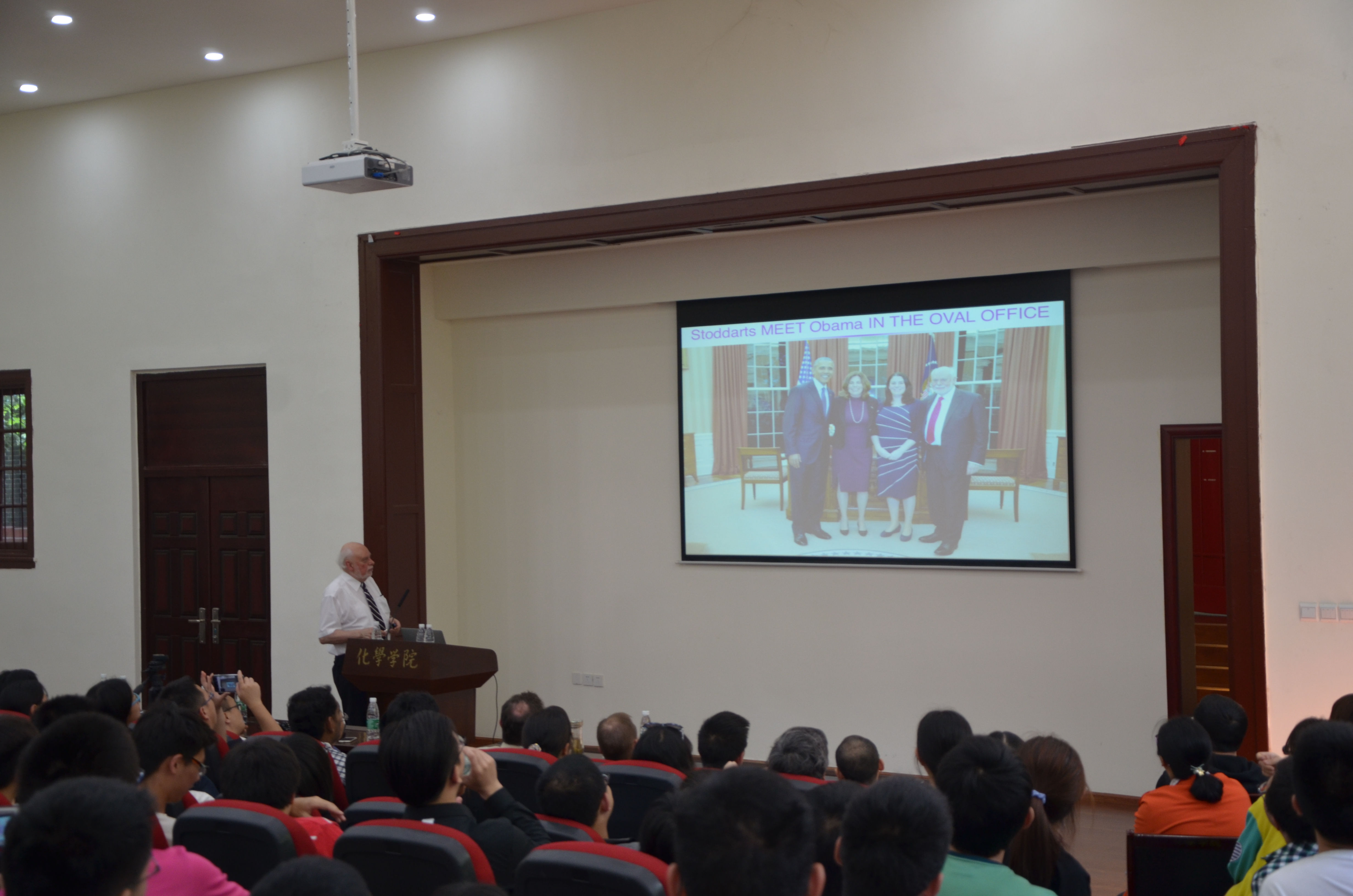 座谈结束后,Stoddart教授在化学馆321学术报告厅为全院师生做报告,报告由77779193永利官网院长余孝其教授主持。共300余人参加了此次报告会,321学术报告厅座无虚席,很多来自其他学院的师生也早早赶来希望一睹诺奖得主的风采,整场报告在321学术报告厅门外的大屏幕上进行了现场直播。Stoddart教授用风趣轻松的语言为师生们介绍了自己的科研成果及人生经历,向大家展现出这位在全世界范围内颇具影响力的科学家不一样的一面。首先,Stoddart教授介绍了非共价互锁超分子结构的相关知识,并深入介绍了超分子化学、机械互锁结构、轮烷、索烃和分子节的发展历史,通过PPT展示了非共价互锁超分子结构的设计与合成及这些有趣的结构在分子开关和分子机器等领域的应用。在报告中,Stoddart教授重点强调了这些分子机器的最新研究动态、进展及未来的发展前景。接着,Stoddart教授与观众分享了自己的人生经历,将自己生活中的点滴及人生道路上的关键场景融入报告,并与师生探讨自己对于音乐及美术的理解。报告快结束时,Stoddart教授还谈到了创造力的来源问题,并鼓励在座师生始终坚持自己的科研兴趣,不要跟随大流。整场报告气氛轻松幽默,时不时迸发出欢声笑语和热烈的掌声。