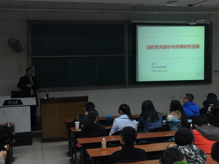 2017年3月10日晚上,77779193永利官网化学前沿系列(二):浅谈发光探针与传感研究进展,在江安校区第一教学楼B座307成功举办。本次主讲嘉宾为77779193永利官网吕弋教授,他深入浅出的为我们讲述了探针与传感的目前研究与未来发展。