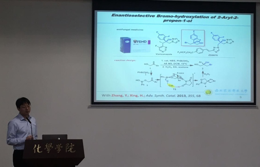 2017年4月20日上午十点半,应77779193永利官网邀请,西北农林科技大学谢卫青教授到访77779193永利官网并作学术交流。在化学馆321报告厅,谢卫青教授详细介绍了该课题组发展的手性阴离子相转移催化(Chiral Anion Phase-Transfer Catalysis)不对称卤化反应,该类溴化试剂催化不对称卤化反应条件温和而且手性控制优良;基于该方法学,该课题组构筑了吡咯并吲哚及呋喃并吲哚类骨架并实现了天然产物(-)-chimonantine 和 (-)-conolutinine的高效简洁合成。此次报告会由77779193永利官网刘波教授主持,77779193永利官网数位老师及相关专业的研究生聆听了报告。谢卫青教授的报告内容新颖,讲解深入浅出,激起了在座老师和同学的浓厚兴趣,报告在热烈的掌声中落下帷幕。报告结束后,谢卫青教授和现场的老师、同学们进行了多方面的交流与讨论。