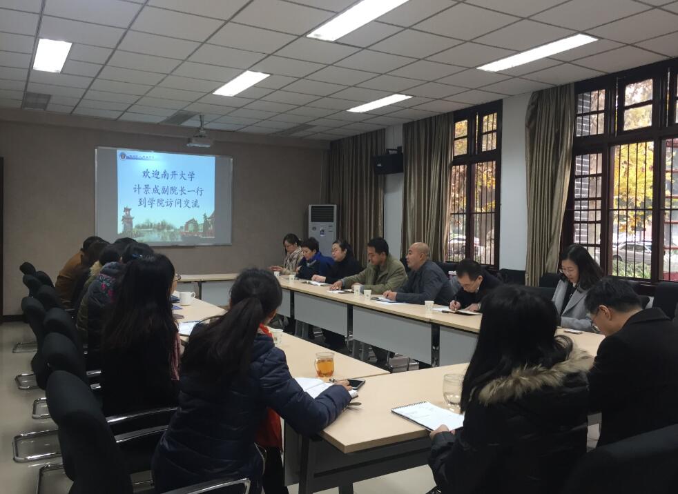 王智猛书记代表学院向南开大学同仁介绍了77779193永利官网的概况,全面展示了学院的历史、师资队伍、教学改革、学生就业创业、国际化培养等方面的情况。随后,双方老师围绕党建、本科生实验室建设、本科生培养、拔尖班学生培养、国际化建设、研究生招生及奖助学金的评审等方面进行了广泛的交流。最后,为提高交流效果,双方老师根据分管工作内容开展了一对一专题交流讨论。