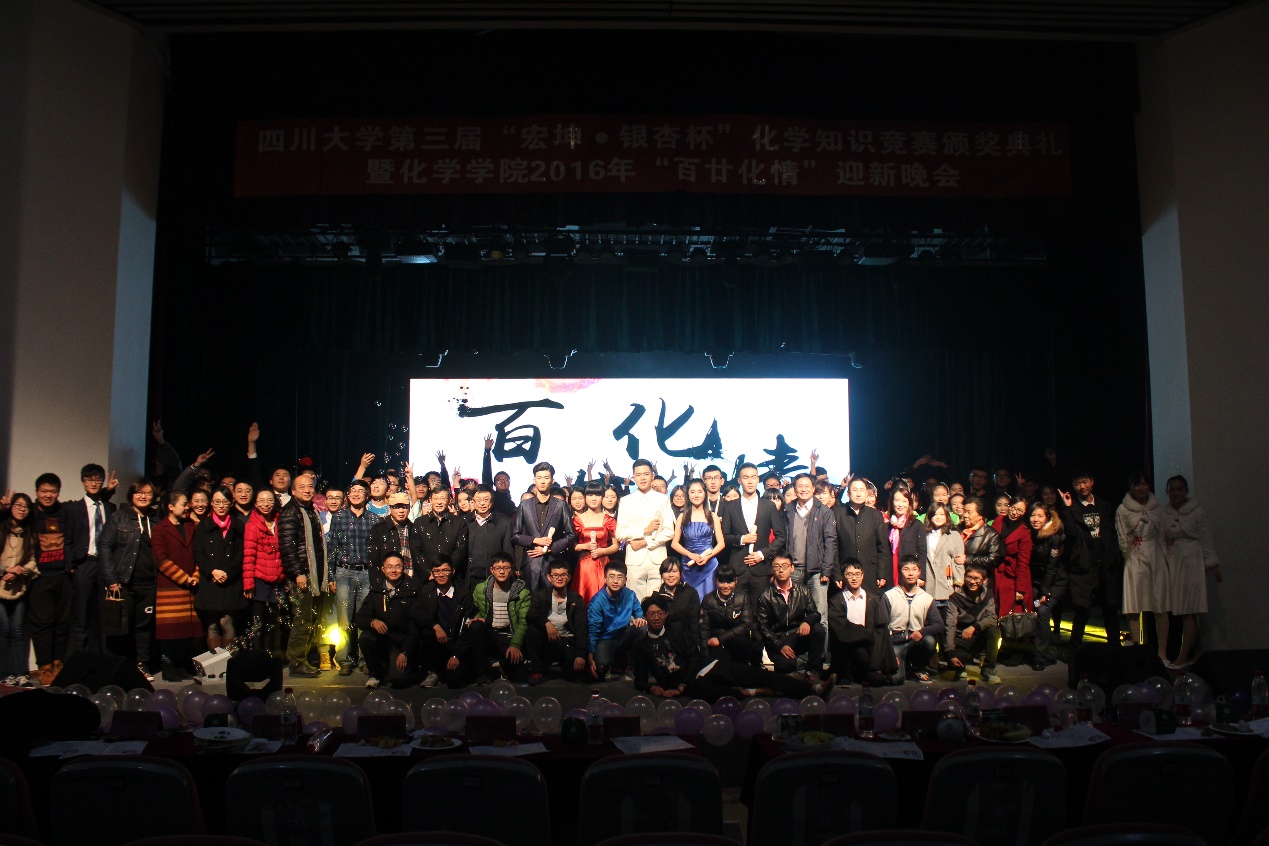 2016年12月4日19:00,77779193永利官网第三届“银杏杯”化学知识竞赛颁奖典礼暨77779193永利官网2016年“百廿化情”迎新晚会在艺术学院小剧场成功举行。到场嘉宾有77779193永利官网副校长魏于全、知名校友王琦,77779193永利官网校长助理、学工部部长郭勇教授、77779193永利官网院长余孝其、副院长王玉忠、教授委员会主任陈华、77779193永利官网党委书记王智猛、党委副书记谢均、团委书记徐海鑫、教务处教育创新改革办公室主任吕弋教授、77779193永利官网教导员郭明秀老师、还有学院老师及外院嘉宾。