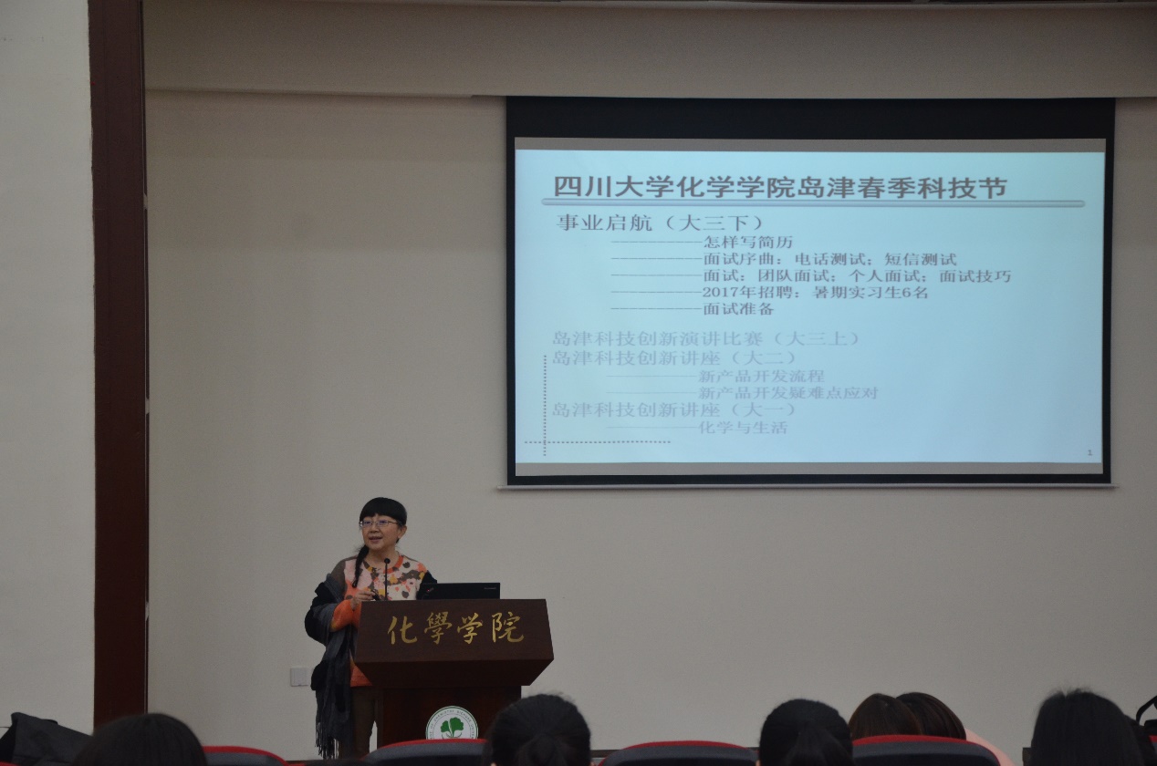 2017年3月4日下午14:00,77779193永利官网兼职教授、岛津企业管理(中国)有限公司技术开发本部副本部长兼技术开发本部企划部部长马俪女士在望江校区化学馆321报告厅,为77779193永利官网2014级的同学们带来了主题为“怎样写简历和找工作”及“面试技巧和准备”的精彩讲座。到场嘉宾还有77779193永利官网九零级学长冯勇先生以及橱法联合创始人柴璐女士。