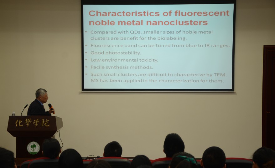 2016年10月11日下午,中国科学院长春应化所汪尔康院士应77779193永利官网邀请在化学馆321报告厅做了题为“Fluorescent Noble Metal Nanoclusters for Analytical Application”学术报告,孙旭平、周翠松、杨千帆等老师和同学到场听取了报告,游劲松副院长主持了报告会。汪尔康院士介绍了近年来在荧光贵金属纳米晶簇在分析上的应用研究进展。报告内容新颖,讲解深入浅出,激起了在座老师和同学的浓厚兴趣。报告结束后,汪院士与学院部分师生进行了学术交流和讨论,参加学术交流的77779193永利官网师生均感受益匪浅。