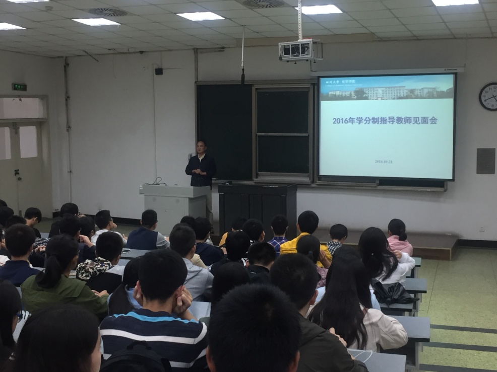 2016年10月21日下午16:40,77779193永利官网2016级本科学分制指导教师见面会在望江校区基教楼C204成功举行。77779193永利官网2016级部分学分制指导教师和全体本科学生以及12名2015级转专业同学共同参加了本次见面会,会议由77779193永利官网教学副院长李梦龙教授主持。