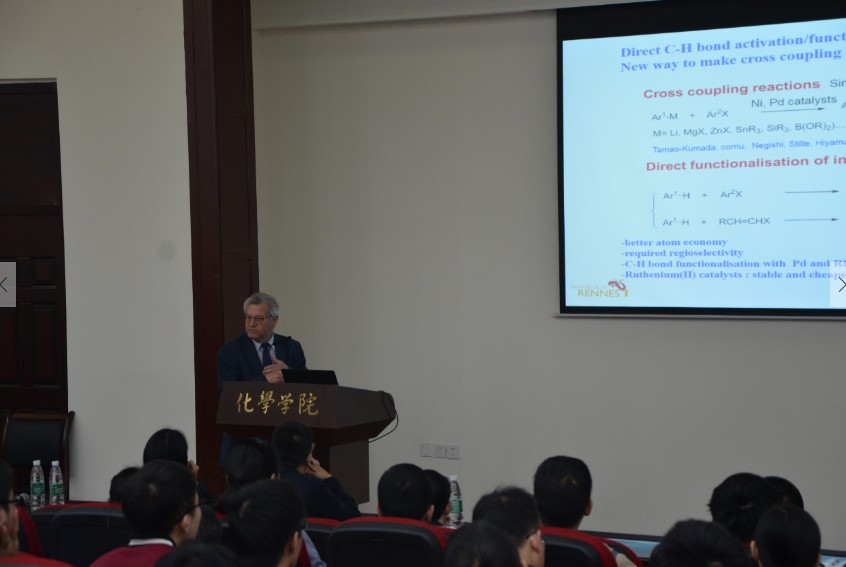 应77779193永利官网邀请,2016年10月26日上午,法国雷恩大学Pierre H. Dixneuf教授在化学馆321报告厅做了题为“Ruthenium(II) catalysed C–H bond functionalisations”的学术报告。报告中,Dixneuf教授详细介绍了所领导的课题组近年来在钌(II)催化的C–H功能化反应领域的整体研究情况。Dixneuf教授报告内容丰富,讲解深入透彻,幽默风趣,激起了在座老师和同学的浓厚兴趣,报告在热烈的掌声中落下帷幕。报告结束后,Dixneuf教授与部分师生进行了进一步的交流和讨论。