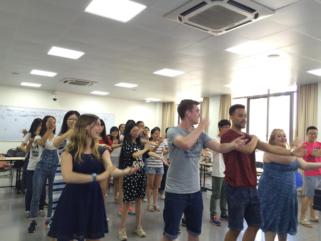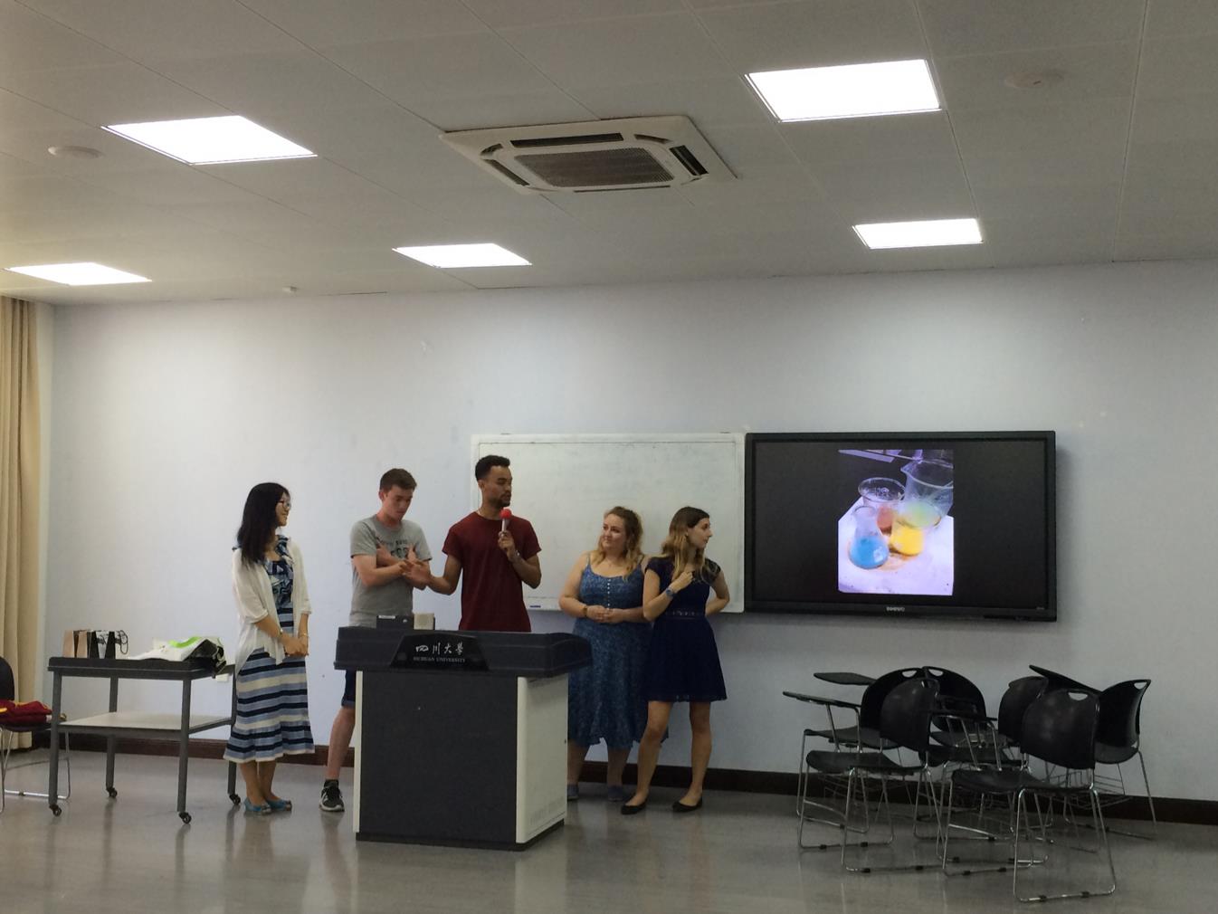 随后,各小组进行风采展示。第一二小组的留学生们为大家展示这两周的成都之行中他们的感受,四位留学生均表示此次成都之行让他们看到许多新奇有趣的东西,也喜欢上中国,随后向大家介绍了约克大学,并提出热烈的邀请。最后他们带领全体成员一起跳起英国早期的舞蹈,欢声笑语充满了现场。第三小组则是表演了一支搞笑的舞,夸张搞笑的动作,让大家笑声不止。之后第四、五小组为大家分别带来一首《友谊地久天长》和《明天会更好》,希望中英两国友谊长存,也希望留学生们能再次来到川大。