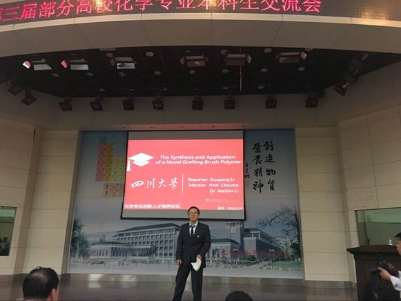 此次化学专业本科生交流会以“化学,让生活更美好”为主题,各高校选派1名本科三年级学生代表就大学生业余科研或运用化学知识解决事迹问题进行大会交流,专家评委评选出一、二、三等奖。来自南京大学、吉林大学、北京理工大学等全国21所高校的化学专业优秀本科学生参加了此次交流会。永利2013级本科学生黎郭平以“The Synthesis and Application of a Novel Grafting Brush Polymer”为题,做了全英文科研报告,并最终获得大会交流报告一等奖。