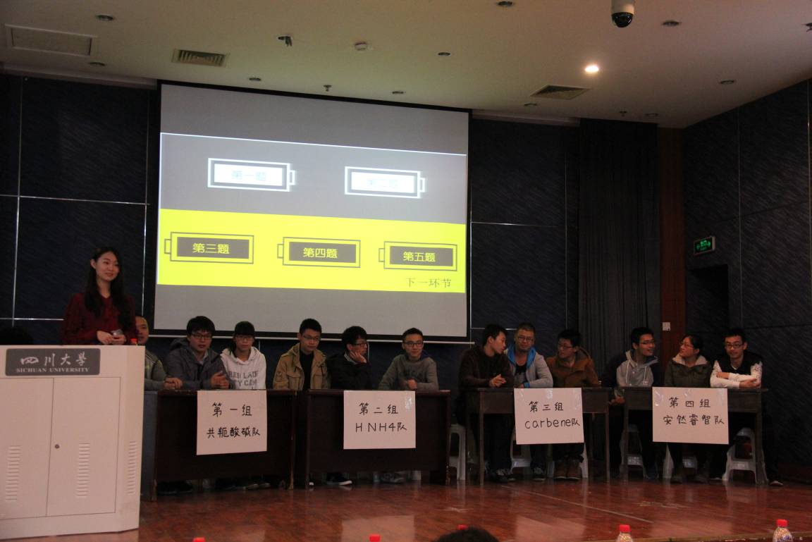 经过初赛、复赛的激烈角逐产生的12位选手分为四个小组:共轭酸碱队、HNH4队、carbene队、安然睿智队。首先进行的是必答题环节,各小组派一名同学从题库中抽取一道问答题,以小组为单位讨论出结果后作答,之后由评委老师点评正确与否并打分。接下来,是选择题回答环节,以选手座次为顺序,依次作答,共进行四轮,之后由评委老师们对选手们的回答进行评析,并对相关化学知识进行讲解,使同学们对相关化学知识的理解更加透彻。