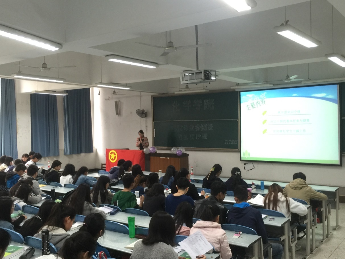 首先,张愉老师和我们一起回顾了中国共青团的历史和发展历程,认真学习了中国共产主义青年团章程,深入了解团的性质以及团旗、团徽的内容、象征意义。接着,又对我们广大团干提出了五大要求:“政治上要坚强,学习上要刻苦,工作要勤奋,作风要扎实,品德要高尚”,希望所有团员干部认真学习团章,审视对照,不断提高自己,把班级带到好的方向。然后,张愉老师又认真介绍了班团干部的职责,并围绕如何做好学生工作做了精彩讲述。在提问环节,同学问到新时期的团员干部被赋予的新的意义,张愉老师一一作了耐心解答。最后,张愉老师分享了几个哲理小故事,希望我们从中有所思考体悟,希望在座的同学都能服务师生,在实践中认真思考总结,不断提高,成为一名合格的优秀的大学生学生干部。