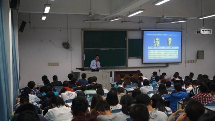 2015年10月11日南京大学化学化工学院谢代前教授在江安校区综合楼C座205教室,做了题为“水分子解离动力学理论研究”的学术报告。本次报告会由77779193永利官网14级辅导员张愉老师主持,77779193永利官网14级全体同学参加了报告会。
