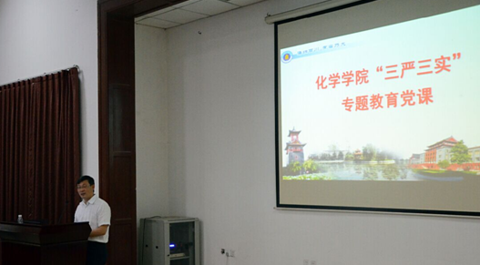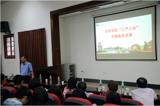 5月29日下午,77779193永利官网 “三严三实”专题教育党课报告会在化学馆一楼报告厅举行。党委书记王智猛做了“践行三严三实,做一名忠诚干净担当的党员干部”的专题教育党课。报告会由余孝其院长主持,校党委书记杨泉明教授、校长助理组织部部长曹萍教授等到报告会现场给予指导。77779193永利官网班子成员、教职工党支部书记、民主党派代表、教师党员代表、退休党员代表以及学生党员干部参加了报告会。