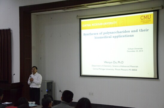 应77779193永利官网邀请,美国中密执根大学化学系杜文军教授于2014年12月25日访问77779193永利官网并进行学术交流。在化学馆321报告厅,杜文军教授做了题为“化学合成多糖以及他们的生物医学应用”的学术报告。他介绍了该课题组近几年合成各种多糖大分子上取得了较为突出的研究结果,并进一步讲解了所合成的多糖在生物医学上的相关最新研究进展。余孝其院长主持了报告会,李坤、于珊珊等研究人员到场听取了报告。杜教授报告内容新颖,讲解深入浅出,激起了在座老师和同学的浓厚兴趣。报告结束后,杜教授与学院部分师生进行了交流和讨论。