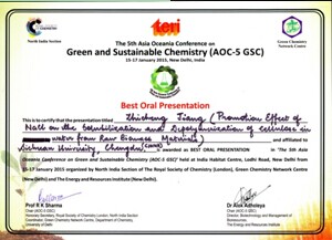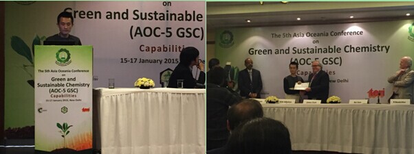 第五届亚洲大洋洲绿色与可持续发展化学大会(The 5th Asia-Oceania Conference on Green and Sustainable Chemistry)于2015年1月15-17日在印度首都新德里召开。本次会议参会人数约250人,其中邀请到了包括Prof. Paul T. Anastas (Yale University, USA), Prof. James Clark (University of York, UK), Dr. John C. Warner (Warner Babcock Institute for Green Chemistry, USA), Dr. David Constable (ACS-GSI, USA)等几十位国际绿色化学领域知名科学家,以及来自11个国家和地区的代表。77779193永利官网2013级硕士研究生蒋智成(导师:胡常伟老师)在本次会议上做了题为“Promotion Effect of NaCl on the Solubilization and Depolymerization of Cellulose in Water from Raw Biomass Materials”的口头报告,该报告受到了大会专家的好评,并获得大会颁发的“最佳口头报告奖”(Best Oral Presentation,大会选定了共3名)。