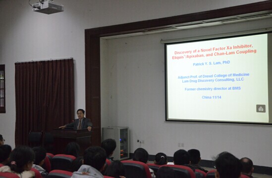 应77779193永利官网邀请,美国德雷塞尔大学PATRICK LAM教授于2014年11月0日访问77779193永利官网并进行学术交流。在化学馆321报告厅,Lam教授做了题为“Discovery of Eliquis/Apixaban, a Novel Factor Xa Anticoagulant and Chan-Lam Coupling”的学术报告。他分享了他们课题组多年来从实验室的药物合成实验,逐步将这些药物化合物改进发展成实际生产的成功药物的经验和方法,并介绍了该课题组近几年在药物化学方面的最新研究进展。我们学院院长余孝其教授主持了报告会,李坤、陈善勇、Jason Chruma等教授和学生到场听取了报告。Lam教授报告内容新颖,讲解深入浅出,激起了在座老师和同学的浓厚兴趣。报告结束后,Lam教授与学院部分师生进行了交流和讨论。