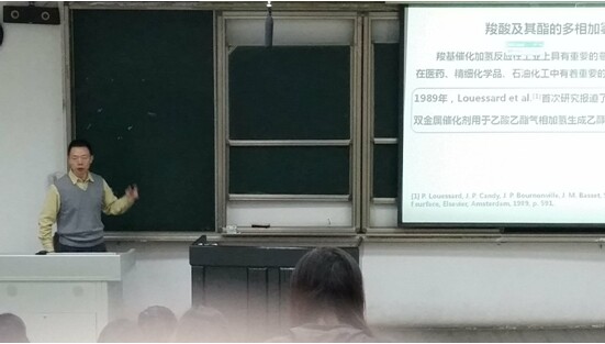 讲座伊始,李瑞祥教授表示,空空而谈地讲解多相催化与均相催化想必同学们也无法理解。李教授说,还是以实例来为各位讲解。接下来,李教授以羧酸及酯的多相催化来为同学们讲解。