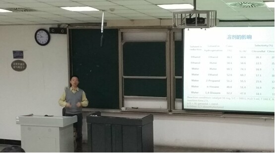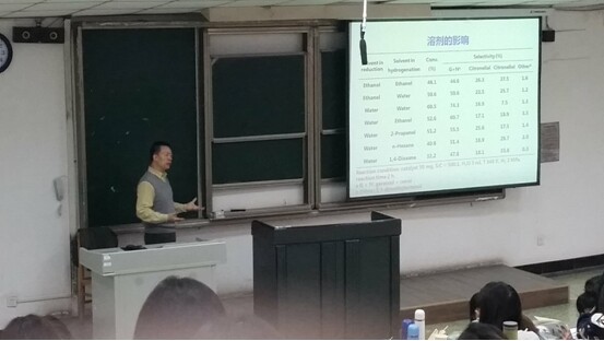 催化作用。均相催化剂首先,李教授为同学们讲解了Ru-Co-Sn催化剂的制备及己二酸二甲酯加氢的反应。通过均相催化的技术,均相催化是催化剂与反应物同处于一均匀物相中的的活性中心比较均一,选择性较高,副反应较少,大大提高了反应的效率。同学们面对如此高效的反应方式表示对均相催化产生了浓厚的兴趣。