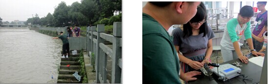 本年度国际交流营的同学被分为六个调查小组,分别对成都周边不同地点的水质,不同的水质指标如pH值、COD、硬度等进行了调查分析。选定调查项目后,各组同学开始积极查阅资料,热烈讨论,认真拟定实验方案,并在各位老师的引导下,不断地对实验方案、实验步骤进行修改完善,确保调查活动顺利进行。随后,各位同学随即投身到简易取水装置的制作、水样的采集、预处理和分析测试等各项工作中。,同时,在调查活动中,同学共同努力,遇到问题一起讨论解决,为留学生和永利同学相互交流提供了良好的契机。