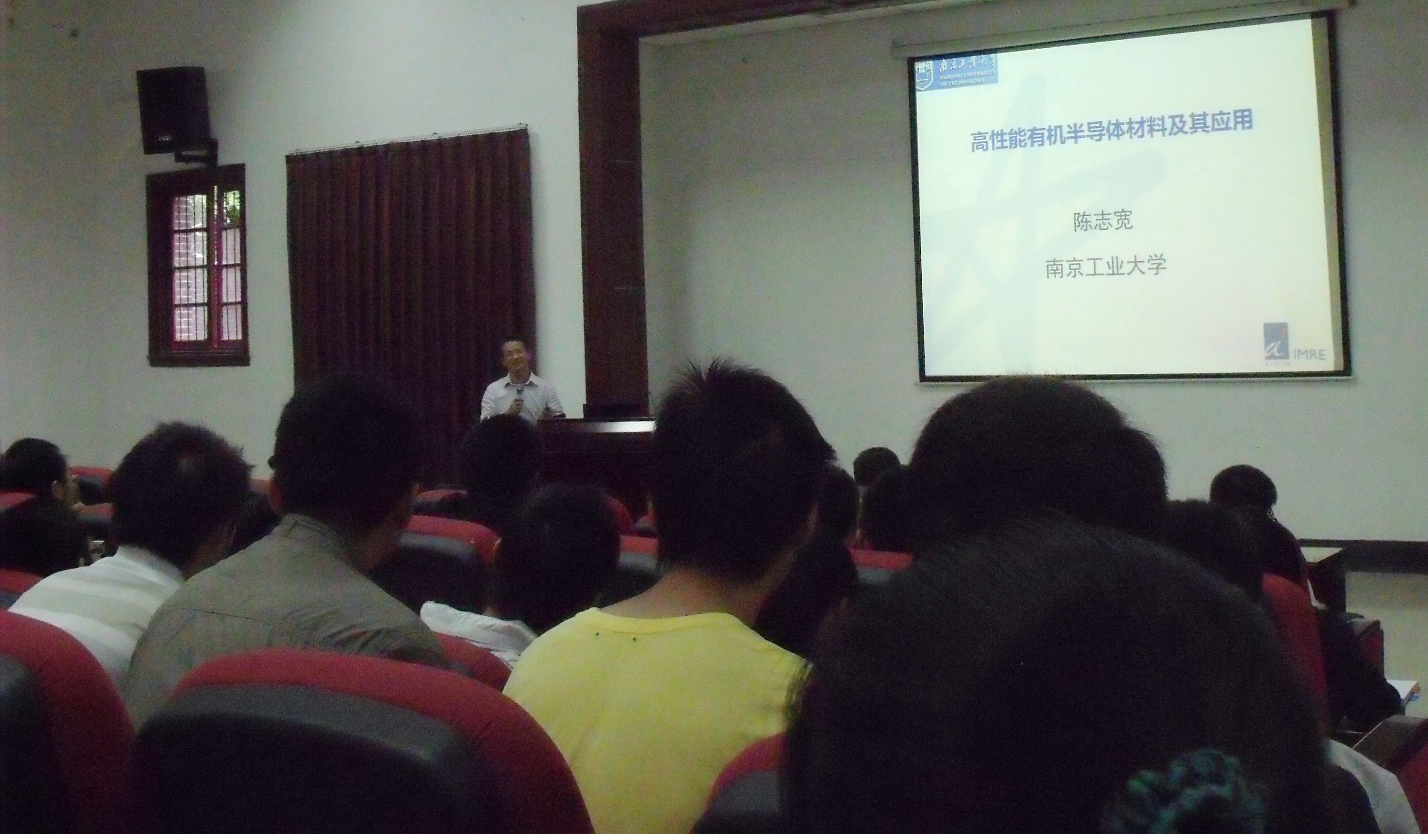 2013年9月5日上午,南京工业大学先进材料研究院陈志宽教授应77779193永利官网邀请,在化学馆321报告厅,作了题为《Development of High Performance Organic Semiconductors for Organic Electronics》的学术报告。陈教授分别从有机电致发光、有机光伏和有机场效应晶体管三个方面介绍了他们课题组在三类有机光电材料的设计制备和器件应用方面的研究工作,很多结果至今还保持着国际领先的水平。随后,陈教授还介绍了南京工业大学先进材料研究院的筹建情况,热忱欢迎立志于从事有机光电的老师和学生的合作和加盟。最后,陈教授还与参会老师和同学就本领域的一些热点问题开展了交流讨论。陈志宽教授简介:南京工业大学先进材料研究院教授,博士生导师。1989年毕业于北京大学,获得应用化学专业学士学位,并分别于1992、1995年获得北京大学有机化学专业硕士及博士学位。1995年,加入新加坡国立大学化学系从事博士后工作,1998年加入新加坡材料研究与工程研究院从事有机电子学的研究。在研究院工作期间,历任研究员,高级研究员,首席科学家,产业化项目负责人。2002年至2006年间任“分子与功能材料部”副主任;2007年至2010年间任“合成与集成部”副主任;2011年任“合成与集成部”主任。2006年至2010年间担任新加坡南洋理工大学材料与工程学院兼职副教授;2011年至2012年间担任新加坡国立大学化学系兼职教授。同期担任新加坡多家公司的首席技术顾问。陈教授主要从事有机光电材料的设计与合成、材料光电特性及薄膜特性、材料的器件特性及其与材料结构的构效关系研究,同时也探索器件制程、器件物理、器件集成等方面的研究。