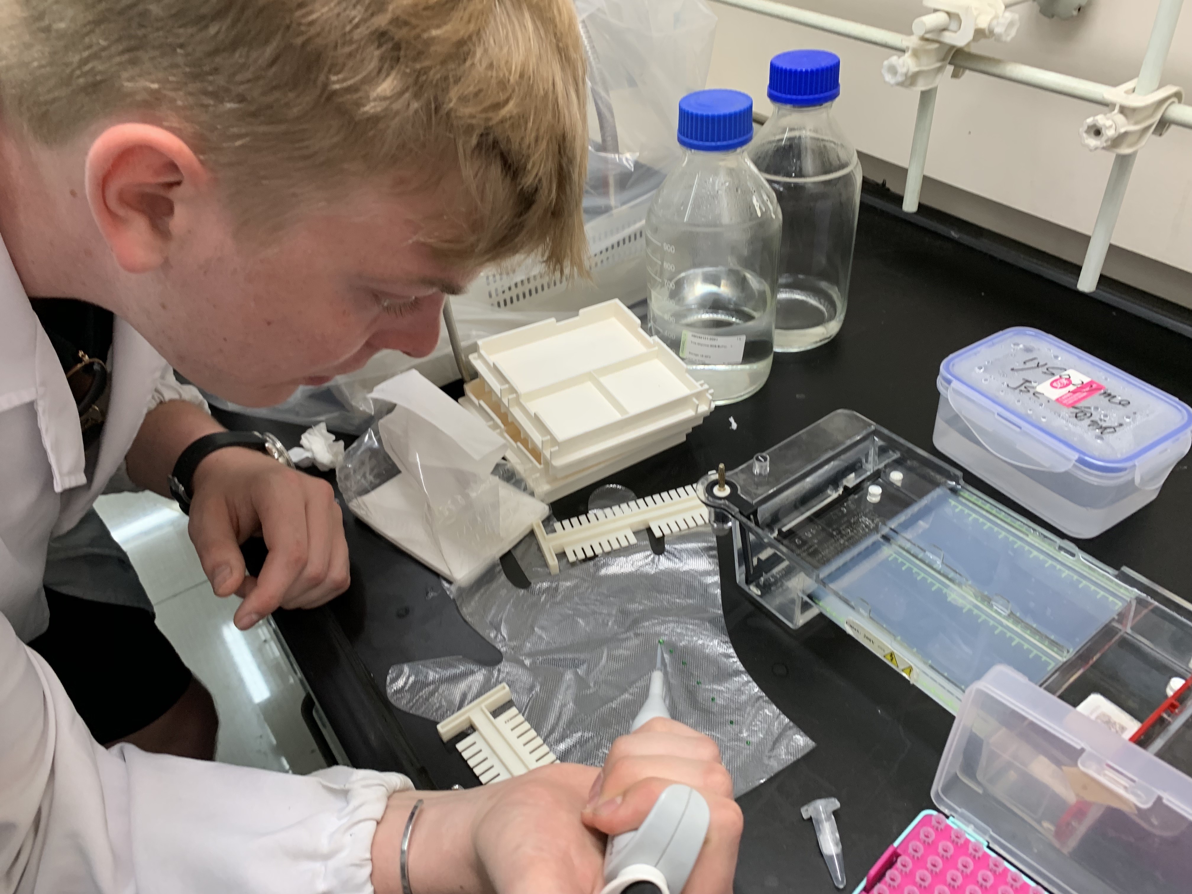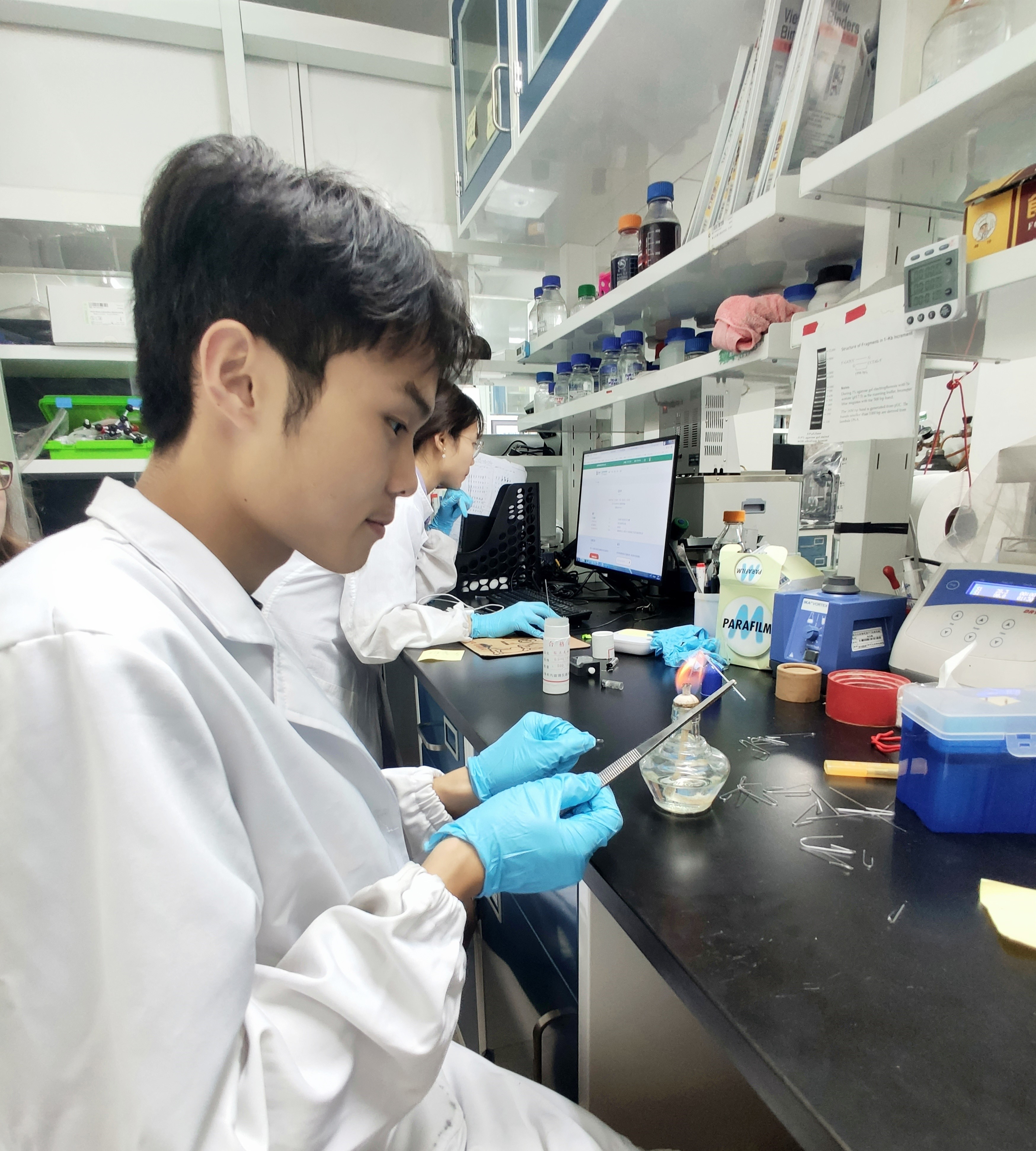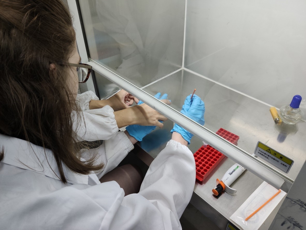 中外学生参与了课题研究中的部分关键实验的操作,如DNA以及蛋白质电泳、功能化大肠杆菌细胞培养、非天然氨基酸的柱色谱分离等。在这些实验中,中外学生学习到了化学生物学和分子生物学中的一些基础实验技术,了解到了科研过程中的基础思维和习惯,感受到了化学前端科研的魅力。