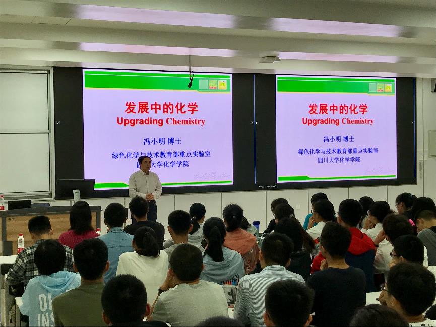 2019年9月5日上午,由中国科学院院士、77779193永利官网教授、博士生导师冯小明教授主讲的化学专业教育讲座“发展中的化学”在77779193永利官网江安校区举行。77779193永利官网党委副书记谢均、教导员郭明秀、2019级辅导员来俏和学院全体2019级本科新生一起聆听了这场精彩的讲座。