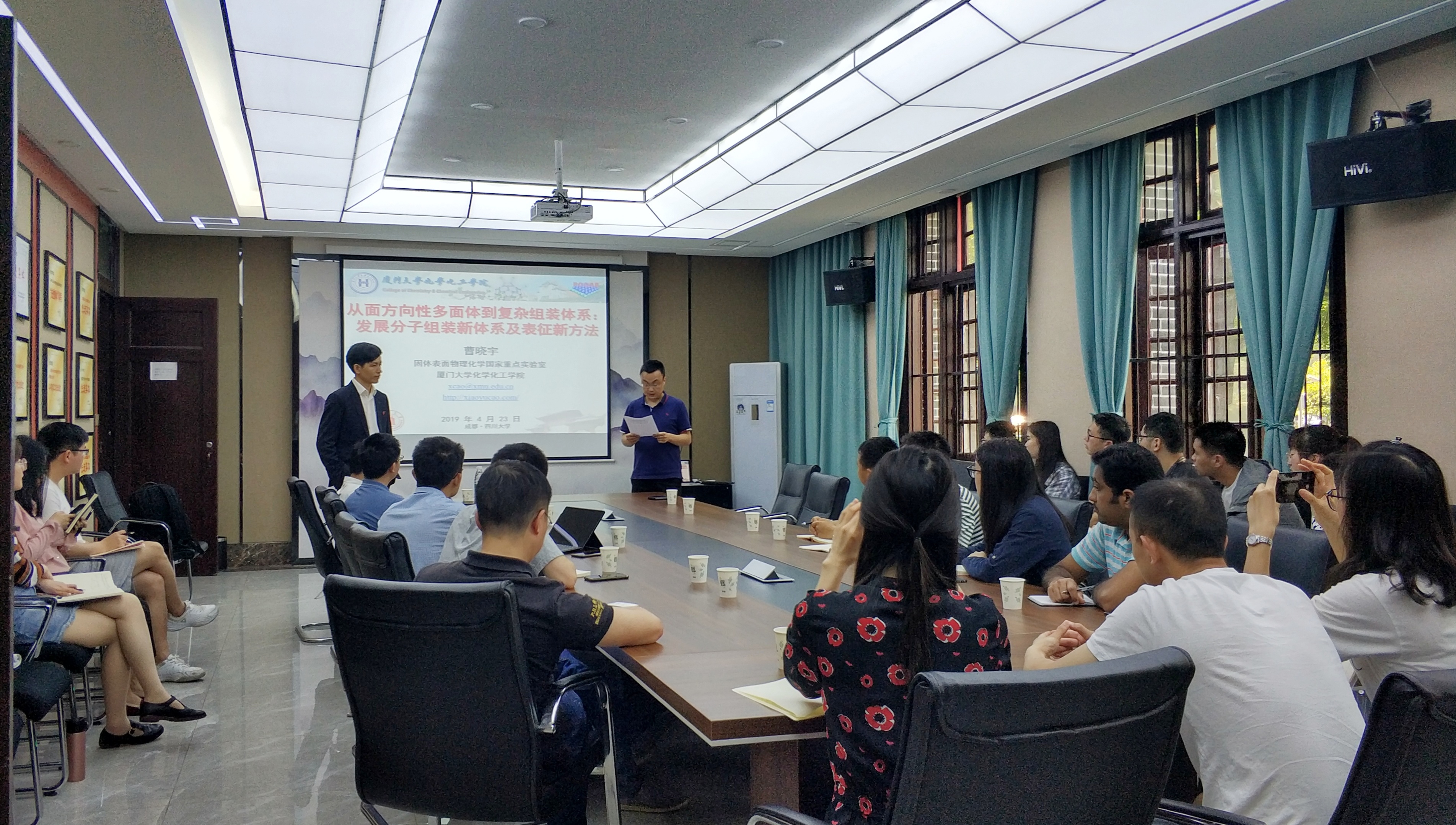 2019年4月23日上午9点,应77779193永利官网邀请,厦门大学化学化工 曹晓宇教授在化学馆122会议室做了题为“从面方向性多面体到复杂组装体系:发展分子组装新体系及表征新方法”的学术报告。此次报告由77779193永利官网杨成教授主持,郑成斌教授、高戈教授、余达刚教授、成楚旸教授、张琦教授等师生参加了此次报告。