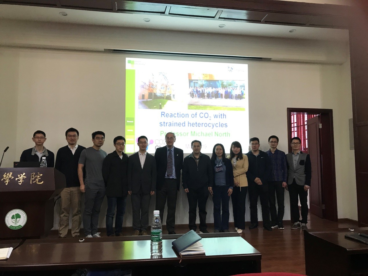 在报告中,North教授首先介绍了CO2利用在可持续发展中的重要意义,随后详细介绍了他们利用CO2合成环状碳酸酯和噁唑啉酮的发展过程。North教授重点介绍了他们课题组发展的高活性催化剂(salen)Al-O-Al(salen),及其高效催化环氧乙烷和CO2在温和条件下构建重要环状碳酸酯的反应机制。在此基础上,他们课题组通过催化剂固载实现了催化剂多次循环利用,降低反应成本,并有望实现工业化。此外,他们通过改变铝催化剂的配体,还实现了氮丙啶和CO2参与的噁唑啉酮的高效构建。整场报告内容丰富,North教授讲解清晰,由浅入深,形象生动地向我们展示了他们课题组近期的工作,在座的师生全神贯注、兴趣盎然。在随后的自由提问环节,在座师生与North教授进行了深入地讨论交流,大家获益匪浅。报告在全场师生热烈的掌声中落下了帷幕,结束后部分老师与North教授进行了合影留念。