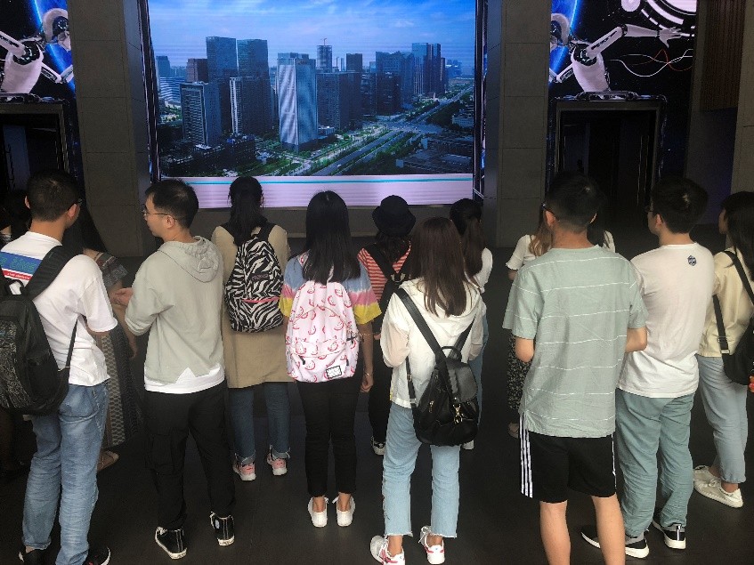 第一站是成都新经济活力区双创服务平台展厅。在专业讲解员的带领下,推开一扇镌刻着130多年前成都老地图的大门,成都新经济发展的亮点便一一呈现在同学们的眼前。“人、城、产”三大主题厅的分割布局,充分展现了成都重才爱才以及城市规划和新经济发展的城市活力。近几年来新经济园区在通信、医疗、材料、人工智能等方面科技创新成果丰硕,通过生动有趣的实物展示,永利师生参与其中互动体验,充分感受到了高新区的新经济脉动。