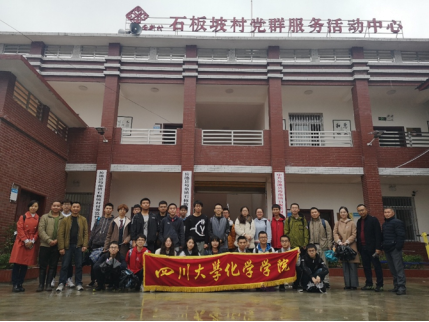 岳池县县委副书记何琪、苟角镇党委副书记冯鸟东和石板坡村干部接待了师生一行。同学们首先参观了新成立的村史馆。村史馆中陈列着的米票、肉票、犁杖、犁剑等物件,还有墙上飘扬的红色党旗和精准扶贫的内容进展,展现了过去的艰辛岁月和越来越好的现在和未来。