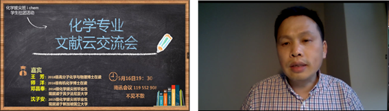 化学拔尖学生i chem社团旨在为本科生提供一个学术方面交流分享的氛围,带动影响更多的同学爱上化学。经过社团成员的共同努力,5月16日19:30化学专业文献云交流会准时上线,本次会议由2019级拔尖班邱江国同学主持。