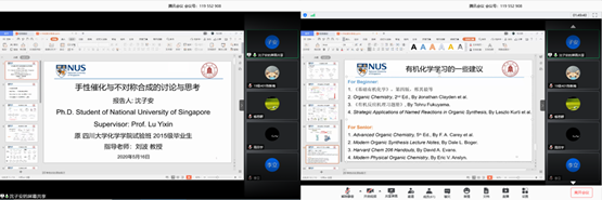 第四位是来自2015级化学拔尖班的沈子安同学(现国立新加坡大学读博)向大家介绍了自己的研究领域─手性催化与不对称合成的讨论与思考,从手性催化的发展,到手性自催化与手性起源,最后为大家提供了有机化学的学习建议。