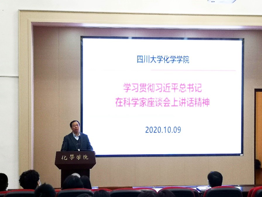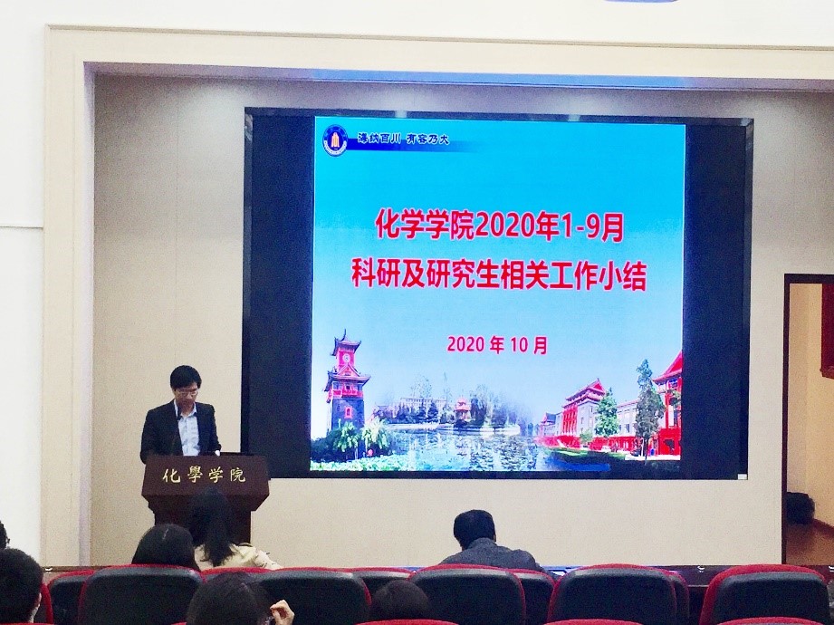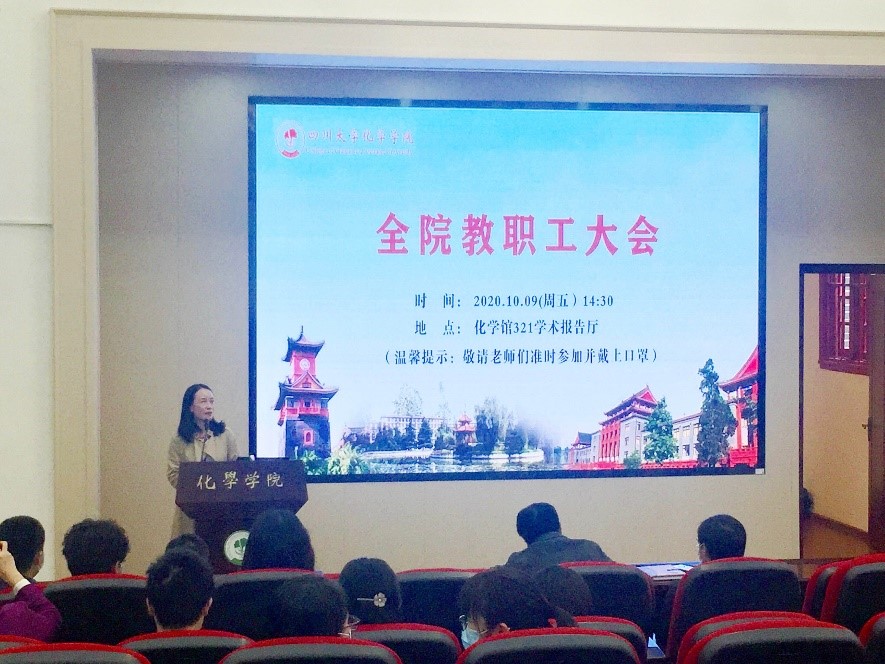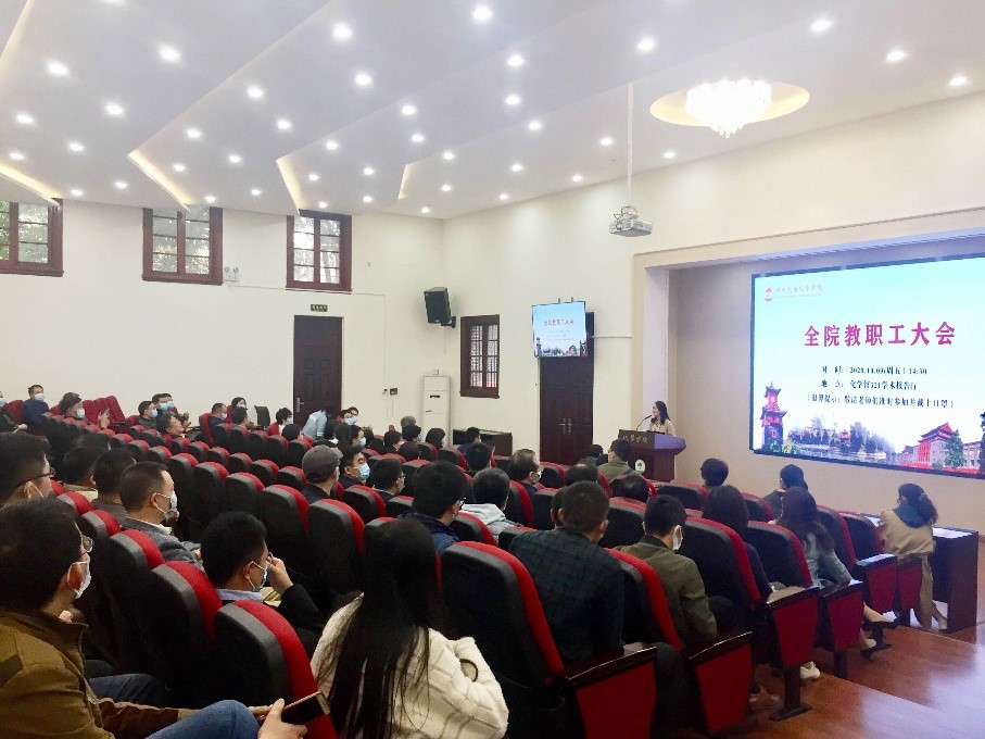 2020年10月9日下午,在化学馆321报告厅召开了77779193永利官网全院教职工大会,总结上半年学院工作,对本学期的教学、科研、管理等相关工作进行了研讨。会议由学院党委书记谢均主持。