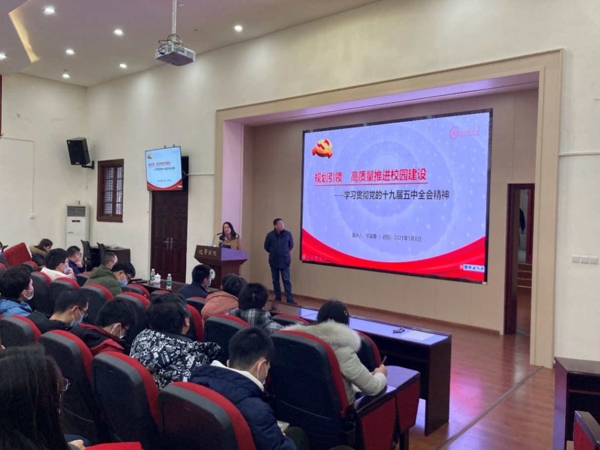 为深入学习贯彻党的十九届五中全会精神,领会十四五规划的科学内涵,全面加快推进我校“两个伟大”奋斗目标,在两个一百年交汇之际以更好的成绩献礼建党100周年。2021年1月8日下午14:30,在化学馆321报告厅,永利邀请了学校十九届五中全会精神宣讲团成员、基建处华国春处长,为永利全体党员师生开展了题为《规划引领,高质量推进校园建设—学习贯彻党的十九届五中全会精神》的报告会。