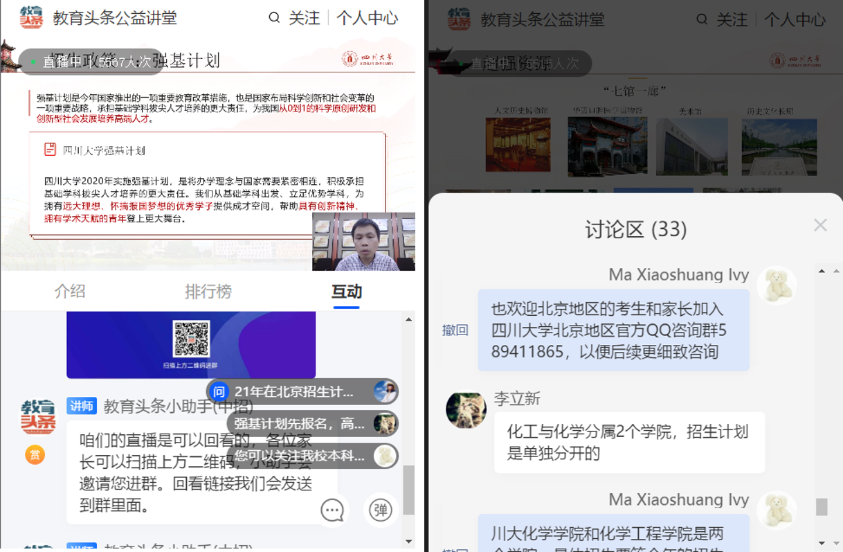 当晚20:00,郑成斌教授在化学馆122会议室开启了招生宣讲直播,从77779193永利官网的历史底蕴、学科实力、教学科研条件、学生就业深造等方面向考生和家长展示了“厚通识、宽视野、多交叉”的本科教育特色和丰富多彩的校园生活,并详细介绍了2021年川大的招生政策,鼓励考生积极报考。宣讲期间,考生及家长在提问区踊跃提问,问题集中在川大优势专业、往年分专业录取情况、专业调剂、强基计划、拔尖计划、中外合作办学等方面,永利及匹兹堡学院招生宣传组的老师一一答疑,加深考生和家长对川大的了解。一个小时的宣讲和答疑似乎不能满足考生和家长深入了解川大的需求,于是我们邀请大家加入77779193永利官网对北京地区本科招生咨询QQ群,方便考生和家长后续咨询。