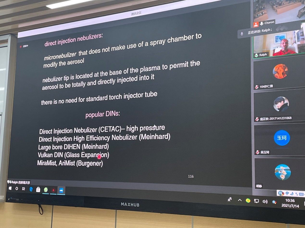 此次课程期间,Sturgeon教授从“Source Diagnostic Techniques“、“ICP Structure and Detection Platforms”、“Sample Introduction Considerations”以及“Interferences in ICP-MS”四个方面深入浅出地向同学们介绍了ICP-MS的相关内容,旨在开拓同学们的科研视野,提升同学们对专业英语的听说读写能力。大家在系统的学习ICP-MS相关知识的同时,更增加了对分析化学的了解和兴趣。虽然受到全球疫情影响,课程只能以线上教学的方式开展,但同学们的学习热情并未因此消减,认真听讲的同时,更在课间积极与老师互动交流与探讨。